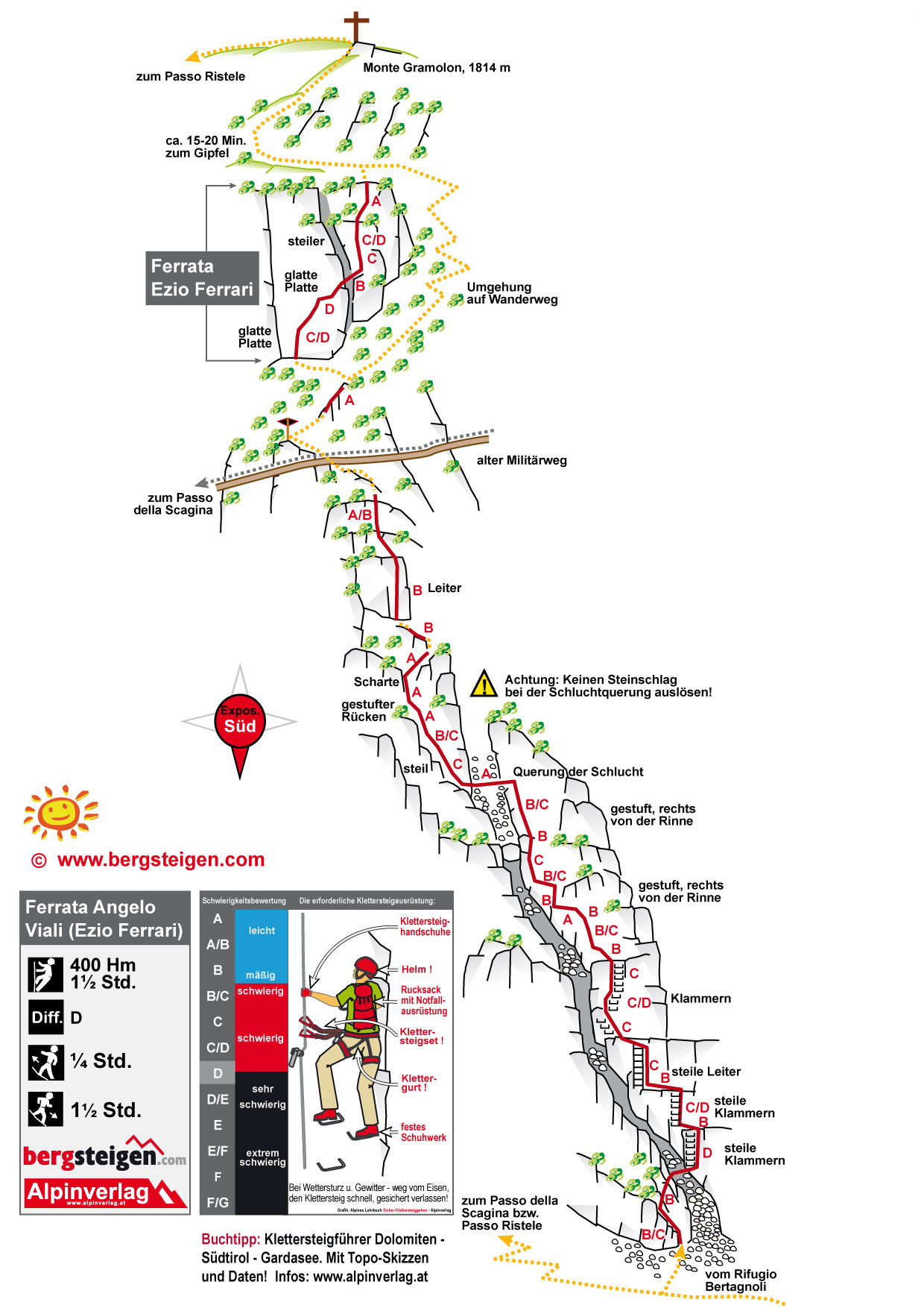 Siehe Topo. Unten ist der Kletterstieg ziemlich durchgehend C bis D, nach oben hin deutlich leichter. Die kurze Via Ferrata Ezio Ferrari ist meist C bis D.