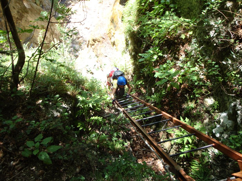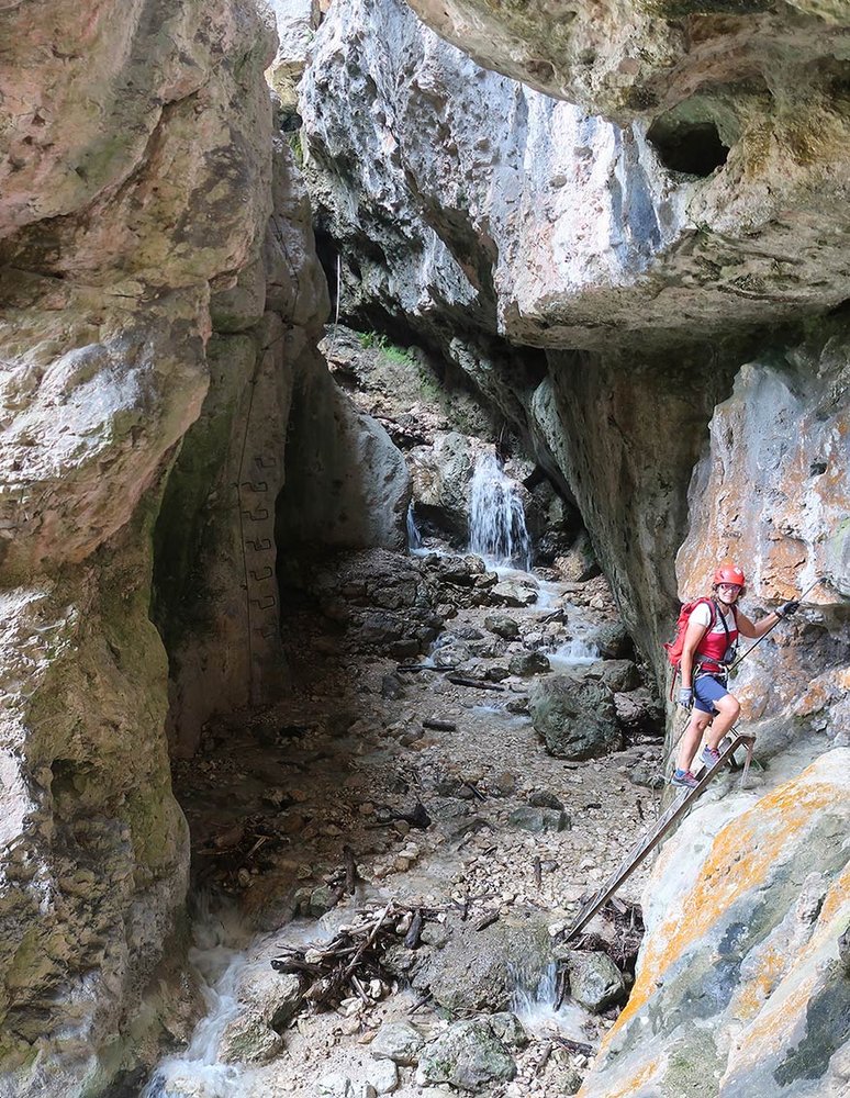 Auf dem Band (A) in die Schlucht, weiter in einen Kessel. Auf der anderen Bachseite führen drei sehr luftige, lange Leitern aus der Schlucht (B und A/B) und nach ein paar Schrofenpassagen (A) erreicht man wieder den Steig. Es folgt eine längere Strecke bergauf, kurze, leichte Kraxelstellen (A) sind zu bewältigen. Bei einem Spalt geht es auf einer kurzen Leiter (A) weiter, über Schrofen (A) erreicht man erneut Gehgelände. Auf einem sehr schmalen und glatt polierten Band (A/B) gelangt man wieder in die Schlucht, wo eine kurze Leiter (A) zum Bach abgeklettert werden muss. Auf der anderen Bachseite eine steile Klammernreihe (B/C, dann B) bis zu einem Band (A) und vorbei an der Madonna, erneut zum Bach. Ab dort eine Gehpassage durch die enge Klamm aufwärts, bis die Schlucht wieder breiter wird. Vor den nächsten Versicherungen kann man rechts zum Wasserfall abzweigen (lohnend). Links gelangt man leicht (A) zu einer Leiter mit einer Plattform am Ende (A/B), nach weiteren kurzen Leiternpassagen und Seilsicherungen (A bzw. A/B) führt der Steig rechts aus der Schlucht, bis zu einem Schotterfahrweg.