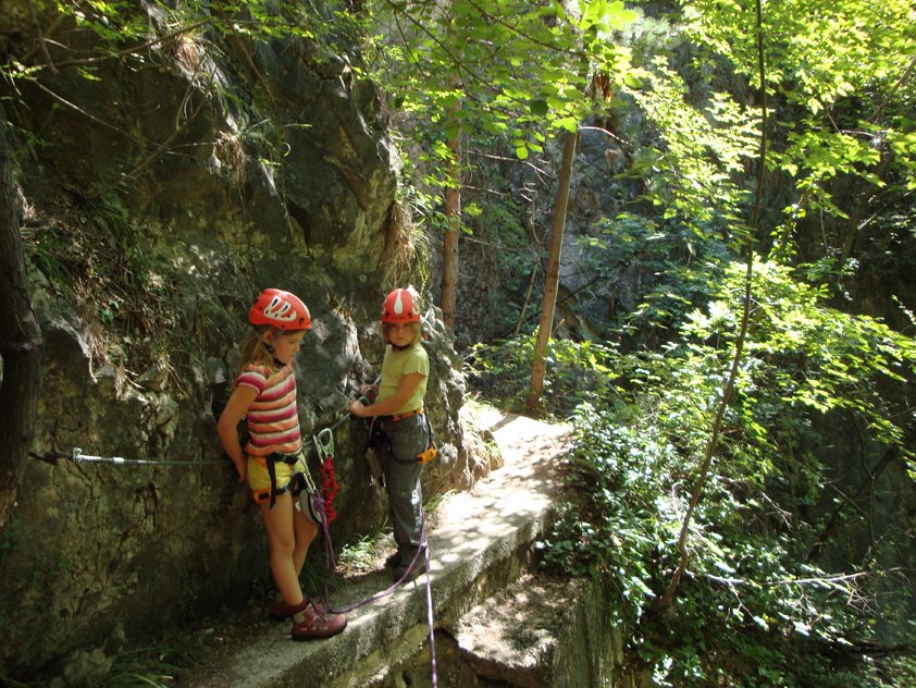 Der Steig ist auch gut mit Anfängern und Kindern zu machen. Im Hochsommer ist es nur auf der Gehpassage im unteren Teil oft heiß, in der Schlucht kühl. Den Steig auf keinen Fall nach Regenfällen oder bei Hochwasser gehen, da die Route oft direkt im Bachbett verläuft und der teilweise recht glatte Fels im feuchten Zustand unangenehm ist! Für kleinere Kinder ist die gesamte Tour trotz der Seilbahnfahrt recht lang, vor allem der Rückweg von der Talstation zum Parkplatz zieht sich etwas (evtl. zweiten PKW deponieren oder nach einer Mitfahrgelegenheit Ausschau halten). Beim Picknickplatz ist auch ein kleiner Teich (Laghetto dell'Ischia). Sonst ist die Tour für Kids, abgesehen von der langen Gehpassage nach dem Leitern-Einstieg, recht abwechslungsreich. In Mezzocorona kann man noch das in die Felsen gebaute Castello di San Gottardo oberhalb des Ortes besuchen. Der Zustieg ist nicht markiert, die Burg wird wegen Steinschlagprobleme nicht beworben – also ein kleines Abenteuer.