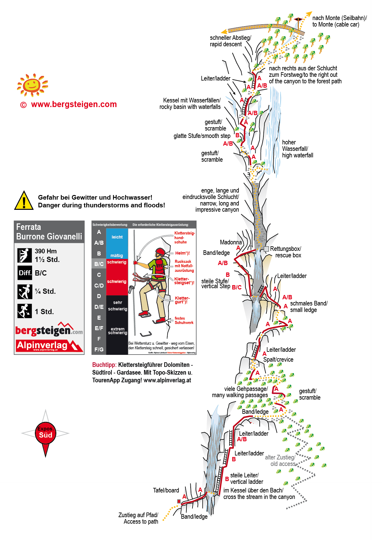 Mäßig schwieriger Stieg mit einer kurzen B/C-Passage (war früher B, die ehemaligen Leitern wurden durch Klammern ersetzt, jetzt einen Tick schwieriger), wenig B-Stellen, meist um A/B und A.