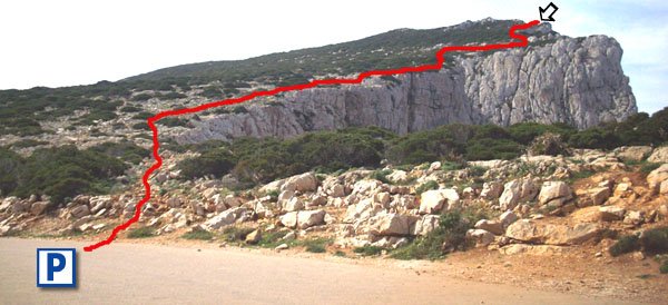 Von Alghero Richtung Flughafen und dann der Beschilderung nach Capo Caccia folgen. Durch die Orte Maristella und Tramariglio und vorbei der Ferienanlage Pischina Salida bis zu einer kleinen Abzweigung, die zum Ausblick-Parkplatzes (Belvedere la Foradada) führt.