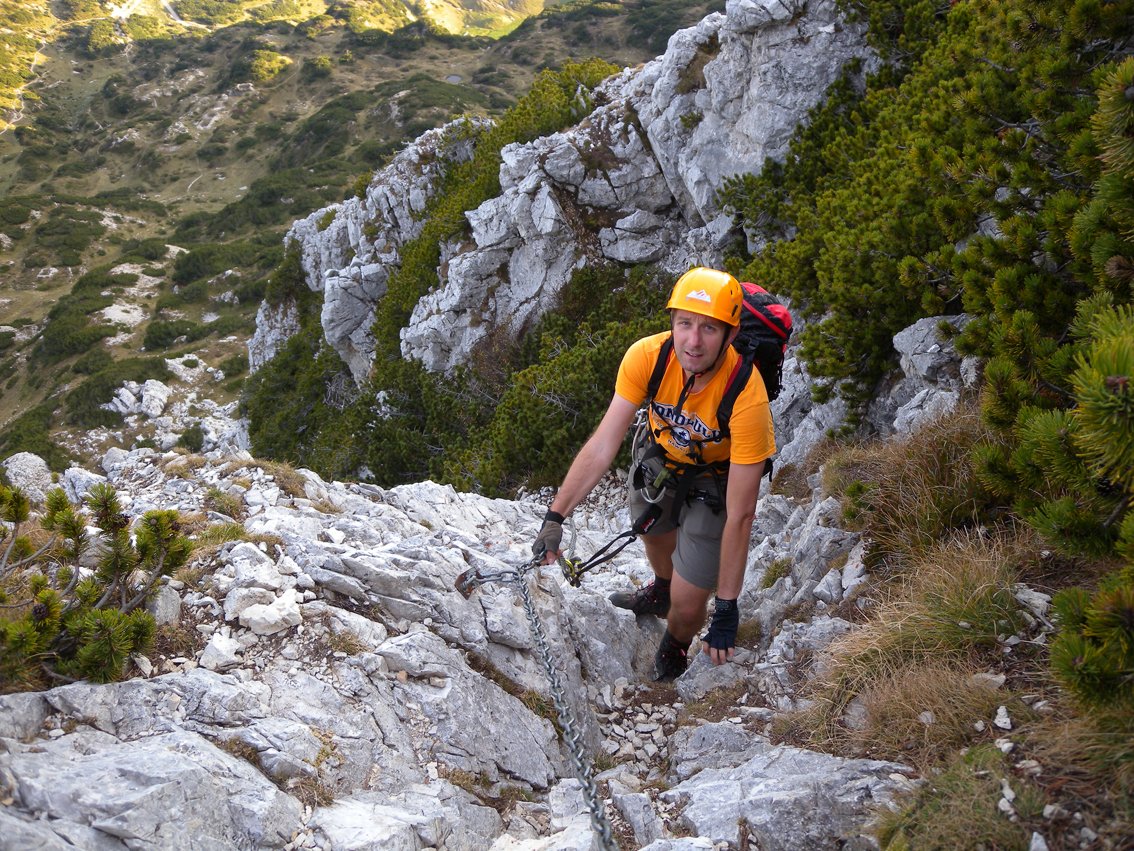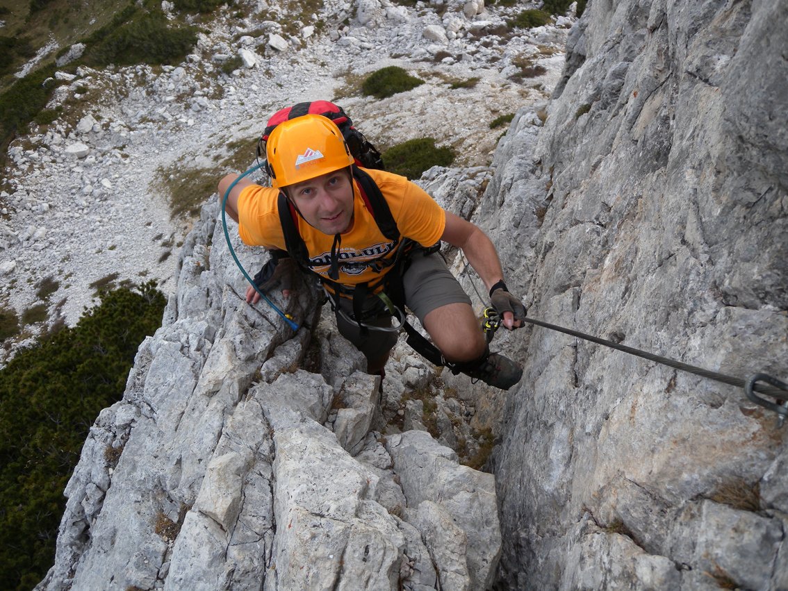 Siehe Topo. Vom Einstieg über einen kleinen Überhang (D), dann kurz steil (C) auf ein Band. Man kommt zu einem steilen Kamin (C/D), danach folgt noch eine steile Stufe (C/D). Nach der Stufe wird es leichter (B/C, dann B) und man erreicht das Ende der Ferrata.