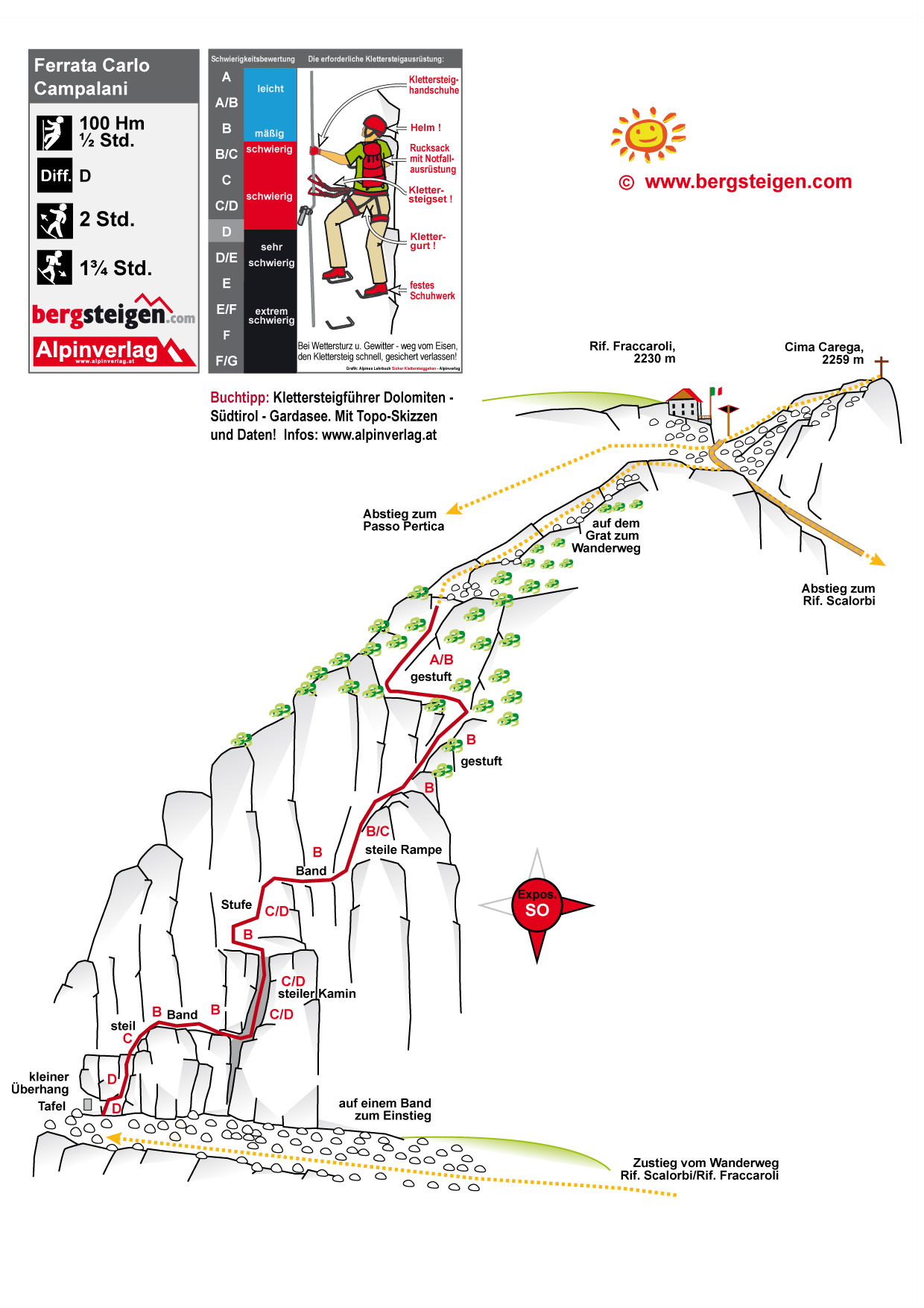 Die Via Ferrata Carlo Campalani ist ein kurzer Klettersteig auf den südlichen Vorgipfel der Cima Carega. Als eigenes Ziel lohnt der Klettersteig kaum, in Kombination mit einem anderen Klettersteig in der Gegend oder mit der Besteigung der Cima Carega wird die Ferrata jedoch Teil eines beeindruckenden Bergerlebnisses. Toller Ausblick von einem der höchsten Gipfel des Massivs (2259 m), auch steht direkt beim Gipfel das Rifugio Fraccaroli.