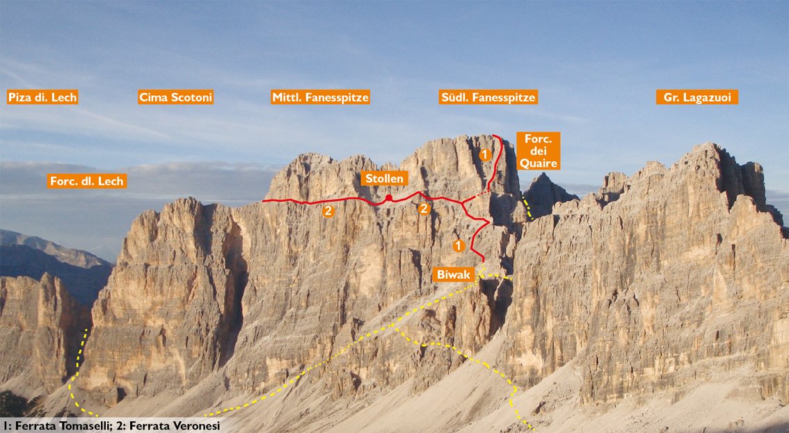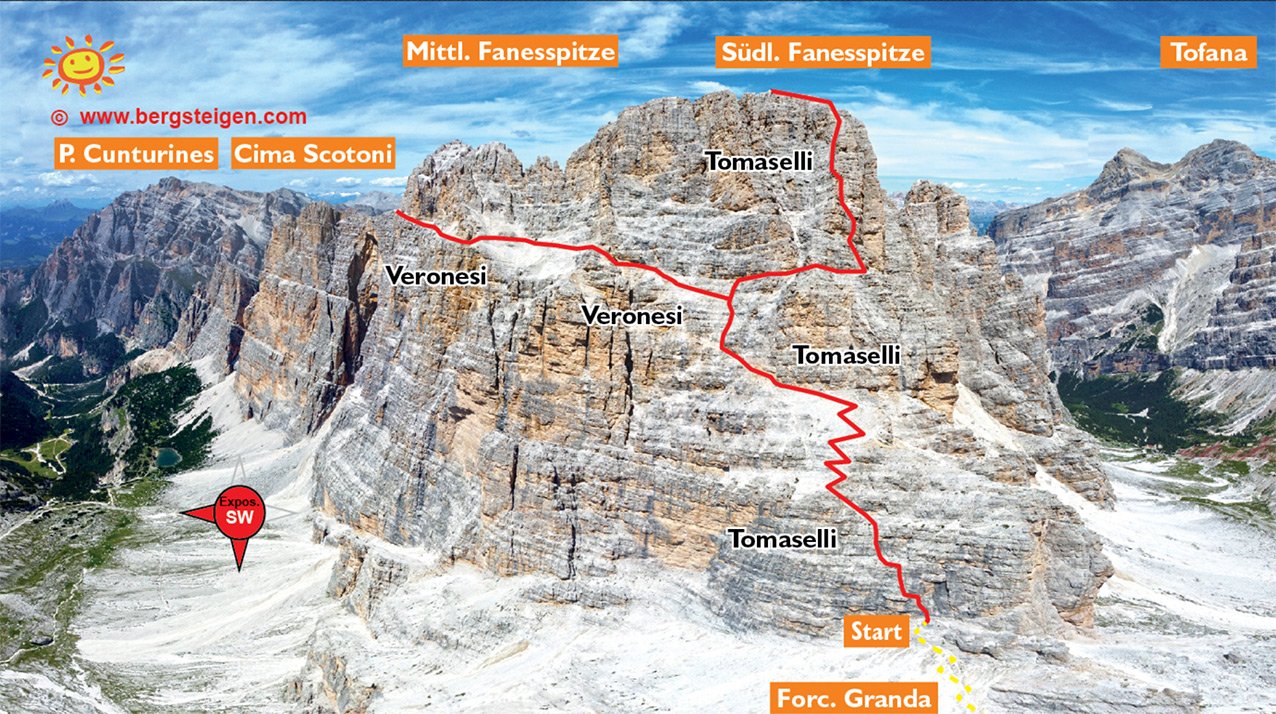 Man sollte die Höhe des Gipfels berücksichtigen! Der Abstieg (Fanesspitze NO-Klettersteig, Stellen bis C) ist teilweise nordseitig, dort hält sich oft länger der Schnee! Der Abstieg wird auch gerne als eigenständiger Aufstieg auf den Gipfel gemacht (Zustieg, siehe Ferrata Veronesi).