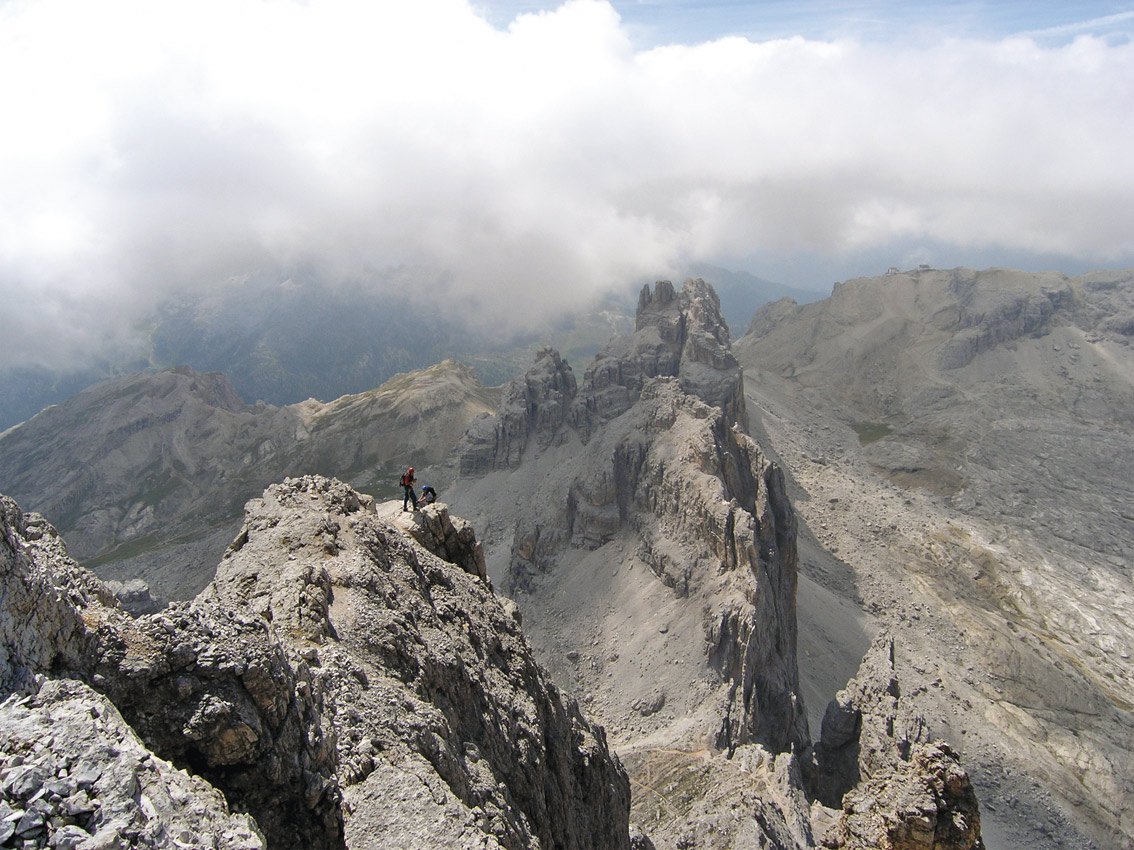 Vom Gipfel folgt der Fanesspitze NO-Ferrata (kurz C, gut versichert, siehe Detailtopo) hinunter zur Forcella dei Quaire. Dann auf Steigspuren südlich zurück zur Forcella Granda. Dort entweder zurück wie beim Zustieg oder besser auf der Westseite des Berges südlich zur Seilbahnstation (markierter und versicherter Steig). Ein wenig östlich von dieser (beschildert) durch den Lagazuoi-Tunnel (Stirnlampe von Vorteil) wieder auf den Zustiegsweg absteigen und zurück zur Passhöhe.