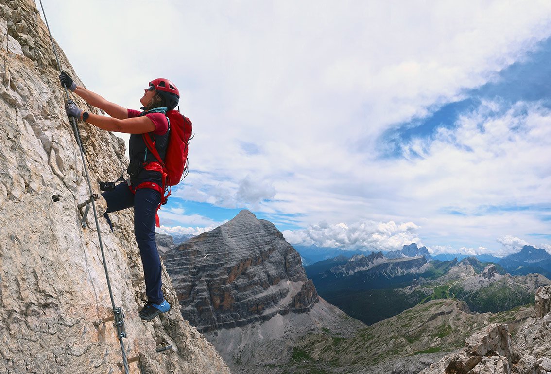 Komplettes Klettersteig-Set und Helm (Stirnlampe für Lagazuoi-Tunnel).