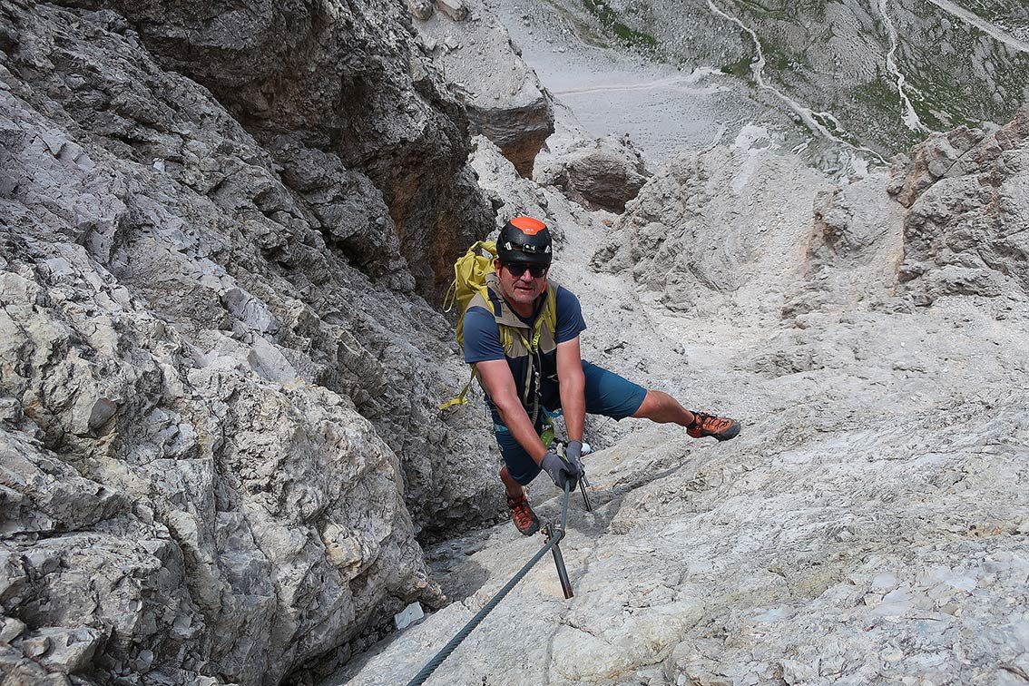Gut mit Stahlseil und ganz wenige Trittklammern abgesichert - es gibt aber auch ausgesetzte, nicht mit Seil gesicherte, Gehpassagen!