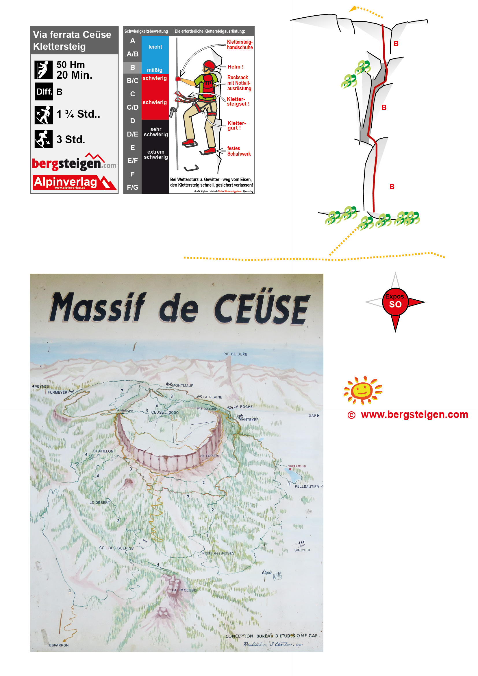 Ceüse gehört zu den Top-Klettergebieten in Frankreich und Europa. Die südostseitig ausgerichtigeten Kalkwände sind bis zu 200 m hoch. An der niedrigsten bzw. schwächsten Stelle zieht auch ein kurzer Klettersteig hinauf aufs Hochplateau. Hat man den 1,5 Stunden langen Aufstieg zur Wand hinter sich quert man am Wandfuß nach rechts, schaut den vielen Kletterern bei ihrem Treiben zu und erreich schließlich die Via Ferrata. Die rd. 50 m sind konstant B und führen hinauf aufs Plateau. An der 2000der Grenze taucht man hier landschaflich in eine großartige, einsame Welt ein mit Edelweis, Murmeltiere und seltene Gräser. Nach rechts geht's in rd. 20 Min. zum Gipfel und linkshaltend beginnt der lange aber wunderschöne Abstieg.