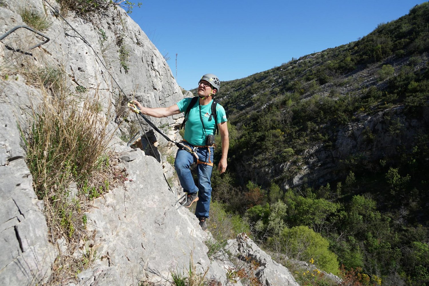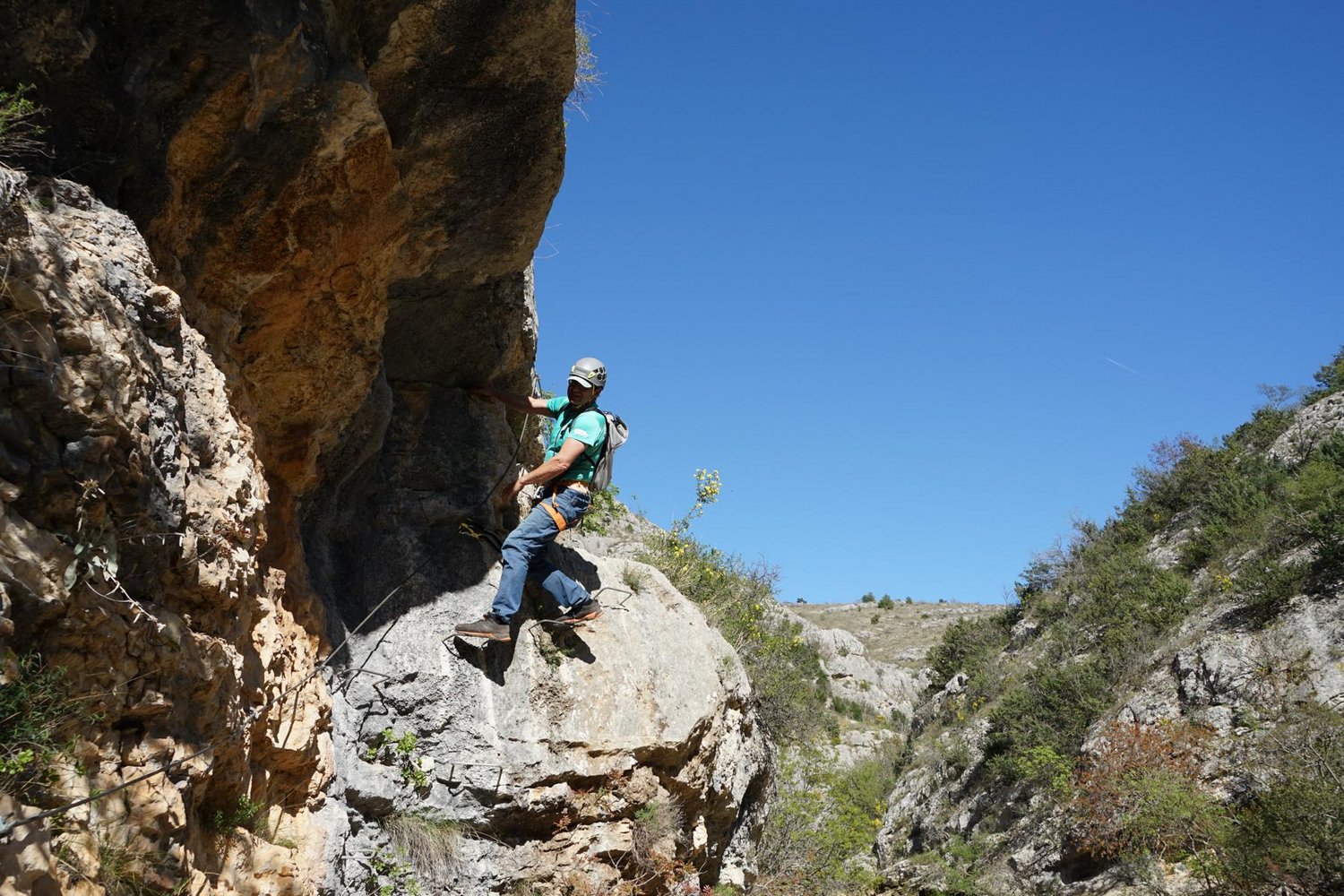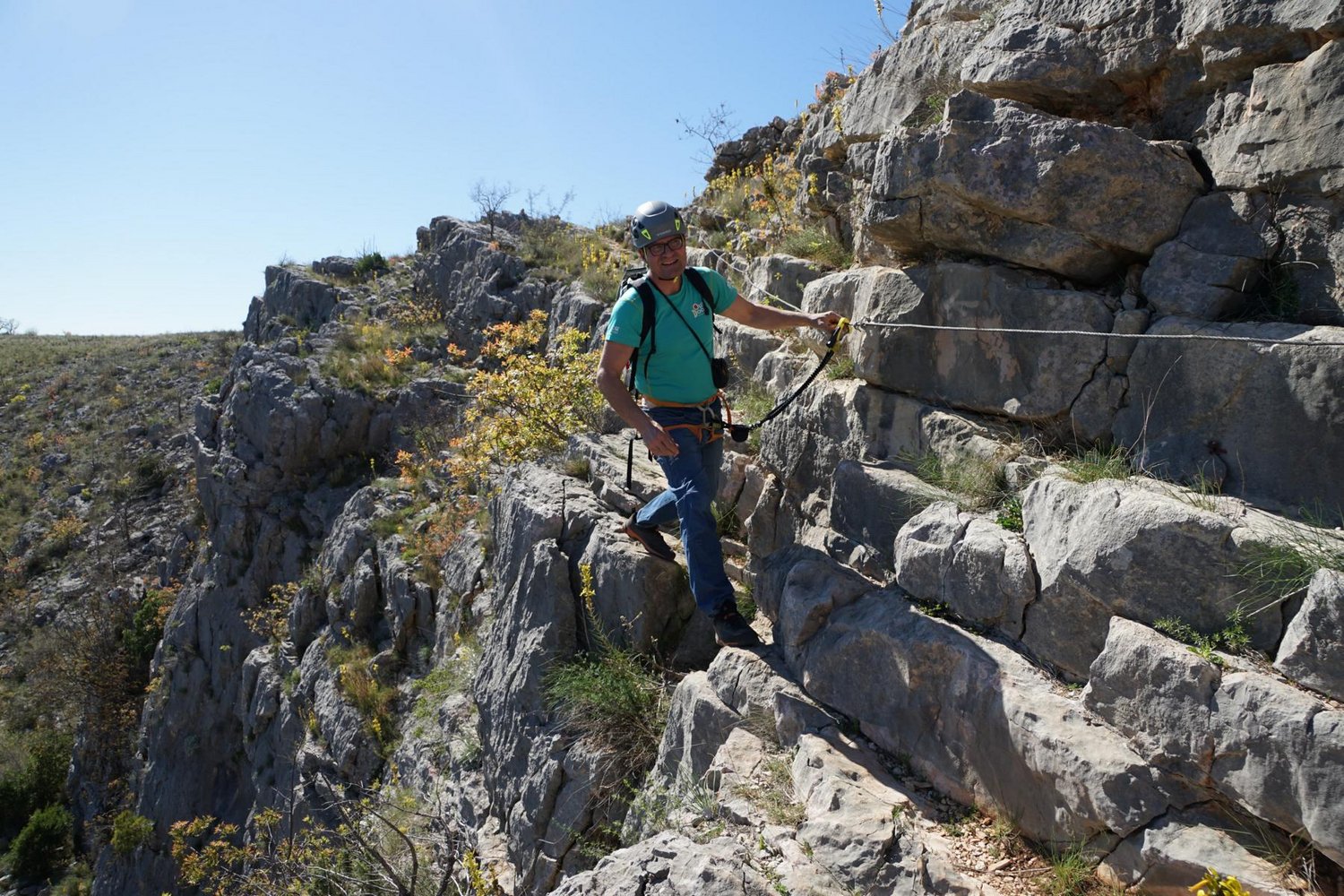 Komplette Klettersteigausrüstung und Helm.
