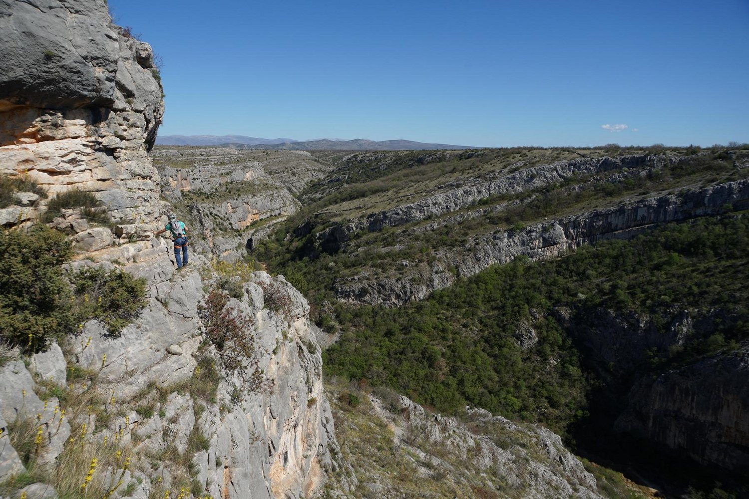 Vom Ende der Versicherungen in einer Seitenschlucht steigt man mit einer langezogenen Kehre auf das Plateau hinauf, dass man bei einer Baumgruppe erreicht. Von der dem Weg zurück zur zweiten Aussichtsplattform folgen und entweder der Wand entlang oder rechts über eine Forstraße zurück zum Parkplatz.