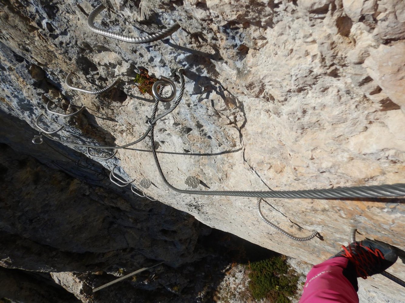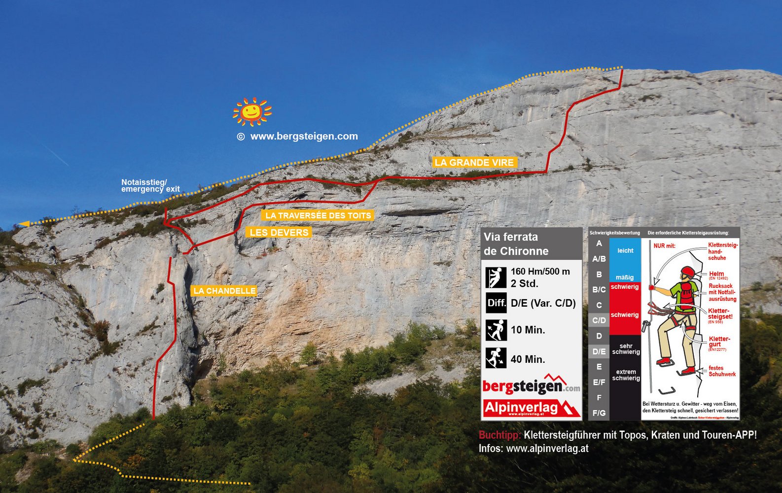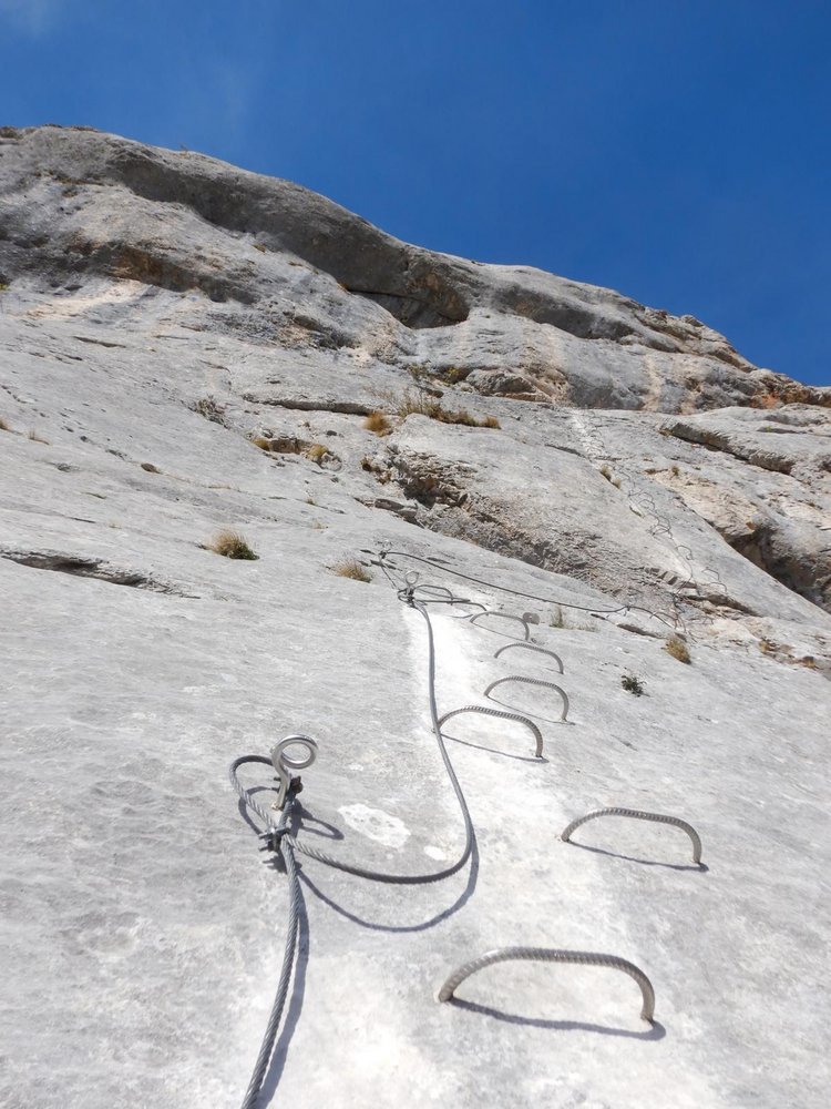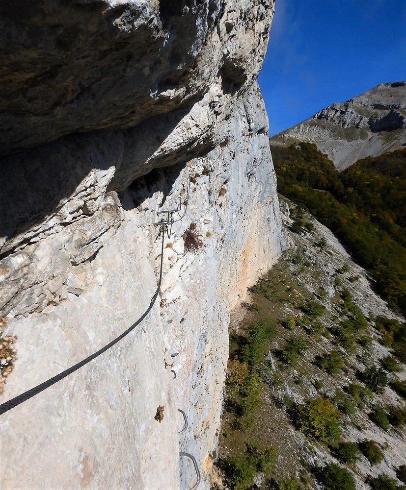 Durch die Einstiegswand auf vielen Bügeln leicht bis `La Chandelle`. Darüber durch eine Verschneidung C/D hoch zu einer Passage hinter einem kleinen Felsturm vorbei. Über einen kurzen Balken. Danach verzweigt sich der KS: Links die leichte Variante und ein Notausstieg. Rechts weiter über einen 2.Balken in eine schräge Querung bis `Les Devers`. Ab hier steil aufwärts auf D zur sehr kraftfordernden, langen `La Traversee des Toits` D/E, die extrem abdrängend ist durch den geringen Abstand zwischen Griffstangen und Tritten. Vorm Ausstieg auf die Gehpassage befindet sich ein Abseilpunkt ACHTUNG 70m! Nach der Vereinigung mit dem leichten Ast folgt die versicherte Gehstrecke `La Grande Vire`. Durch eine schöne Schlusswand auf Bügeln hinauf zur letzten C/D-Stelle im Ausstieg.