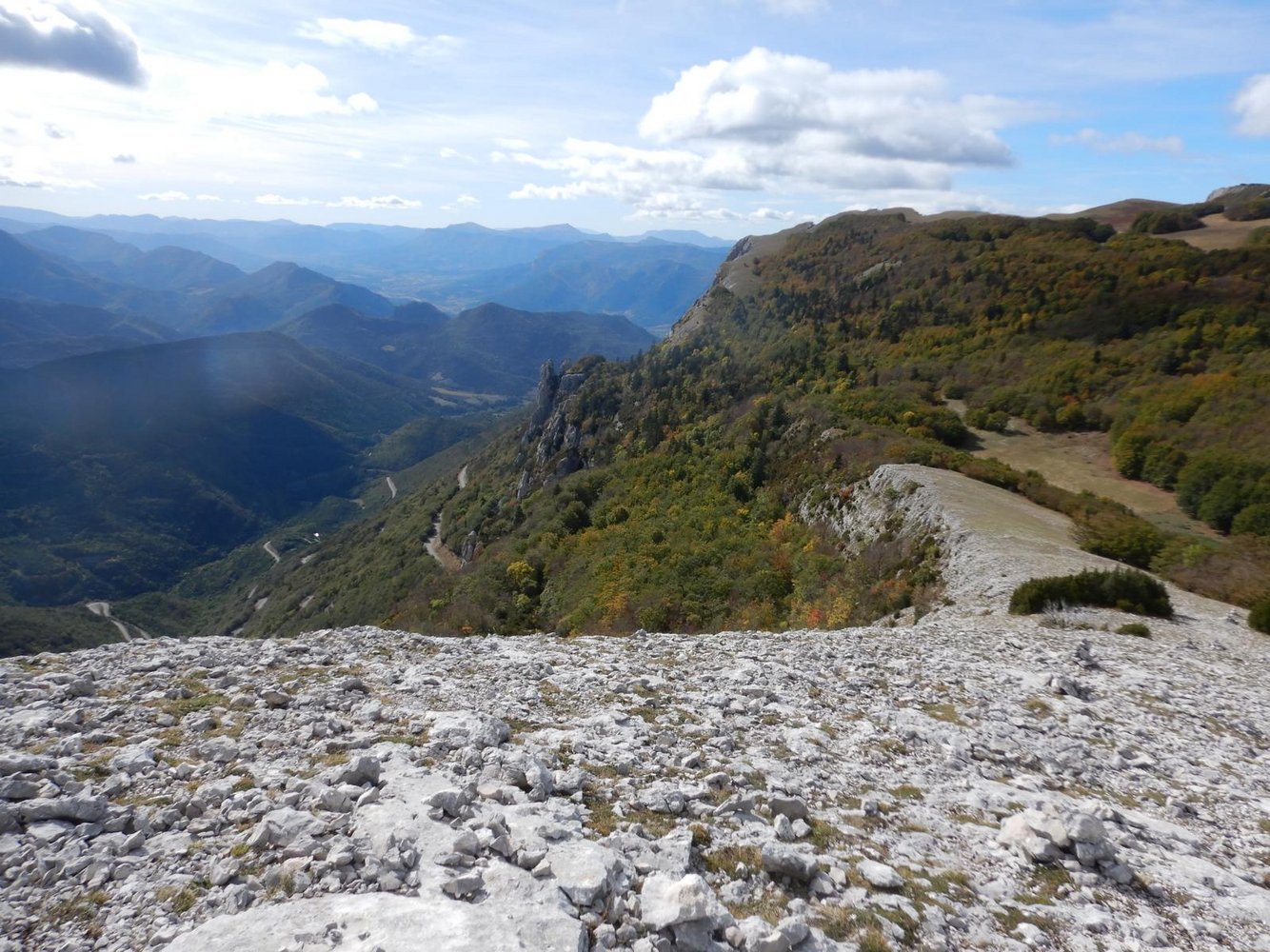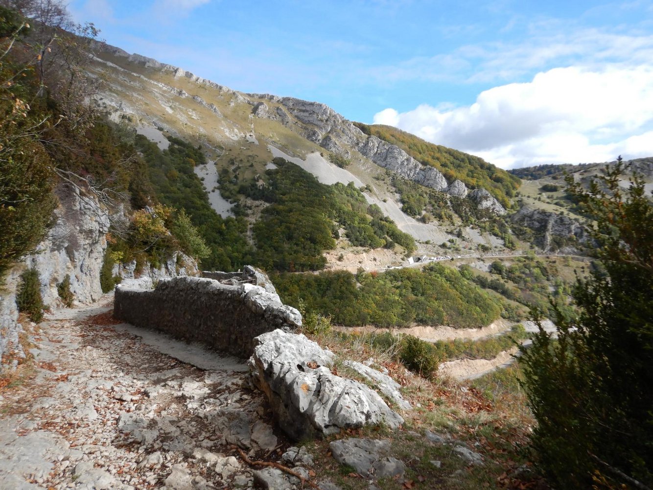Den Steinmännchen nach links folgen. Dann weiter abwärts auf einem teilweise versicherten Pfad. Dann auf einem Wanderweg im Wald, der zum Pass zurückdreht.