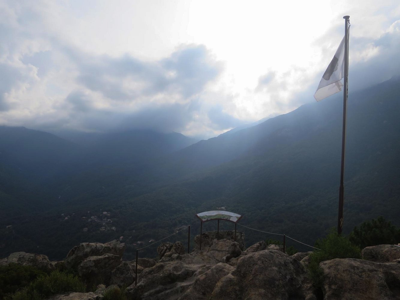 Ein Seil führt hinab zur 50 m langen, recht wackeligen Tibet-Brücke (3-Seil-Brücke mit zusätzlichem Sicherungsseil darüber) ohne seitliche Satbilisierungsseile. Danach folgt eine Hängebrücke mit Trittbrettern. Nach kurzem Gehglände gelangt man zur 100 m langen Tyrolienne “U Pinu”. Rechts befindet sich das Sicherungsseil (“longe”). Auch hier gilt zuvor empfohlenes. Auch hier gibt es vor dem Landepunkt ein Karabiner mit Bremsseil von unten. Es folgt anschließend gleich nächste Seilrutsche, die 80 m lange “U Ditu” zu einem Felszacken, den ein Fahnenmast ziert. Bei dortigem Landepunkt hängt das Bremsseil von oben, geführt von einem dritten Seil. Anschlißend läuft man über eine 3-Seil-Bücke und eine Hängebrücke bergab zum Highlight: der 230 m langen Tyrolienne “U Pitricaghju” hinab ins Tal. Auch hier gibt es rechts vom Rollenseil ein Sicherungsseil (“longe”) und vor dem Landepunkt ein Bremsseil von unten. Bei Landepunkt endet der Klettersteig (65 min.).