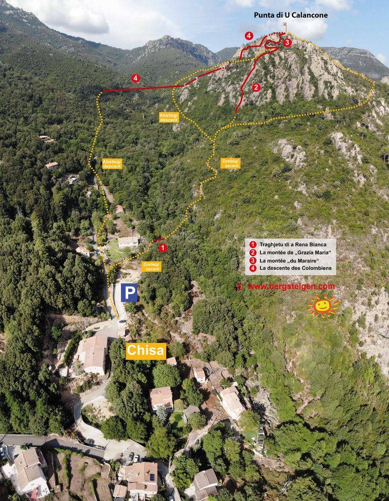 Man geht in das Restaurant hinauf, wenn das Holzhüttchen verschlossen ist und meldet sich für den KS an. I.d.R. ist das Haus täglich geöffnet zwischen 09:00 und 14:00 Uhr von Juni bis einschl. September. Dort zahlt man für die Registrierung sein Obulus und der Betreiber - das Office de la Mairie de Chisa (Tel.04 9557 3111, oder 04 9557 8424) - ist dadurch versichert. Wer KS-Marial benötigt, zahlt einen Pauschalpreis, egal was und wieviel man sich ausleiht pro Person. Wichtig ist auf jeden Fall neben dem üblichen Anseilmaterial die Doppelseilrolle bis 13 mm Seil-Dmr. Man kann auch eigenes Material benutzen, sofern es den Vorstellungen des Betreibers entspricht. Beim Holzhüttchen ist ein kurzes Drahtseil gespannt. Dort bekommt man die Benutzung der Seilrolle gezeigt. Danach kann man starten. Man läuft vom Parkplatz links unterhalb der Straße hinab in eine bewaldete Bachschlucht und folgt orangenen Markierungen an den Bäumen einem vermoosten Holweg zum Bach Vadina Maiò. Entweder über Steine über den Bach, oder über die dortige 20 m lange 3-Seilbrücke beginnt danach der Zustieg zum Felsen. Unterwegs kommt man zu einer Gabelung, wo von rechts ein Fluchtweg vom Gipfel („Sommet“) ankommt (25 min.). Man folgt jedoch nach links dem Wegweiser „Depart“ und erreicht nach 7 min. den Felsfuß.