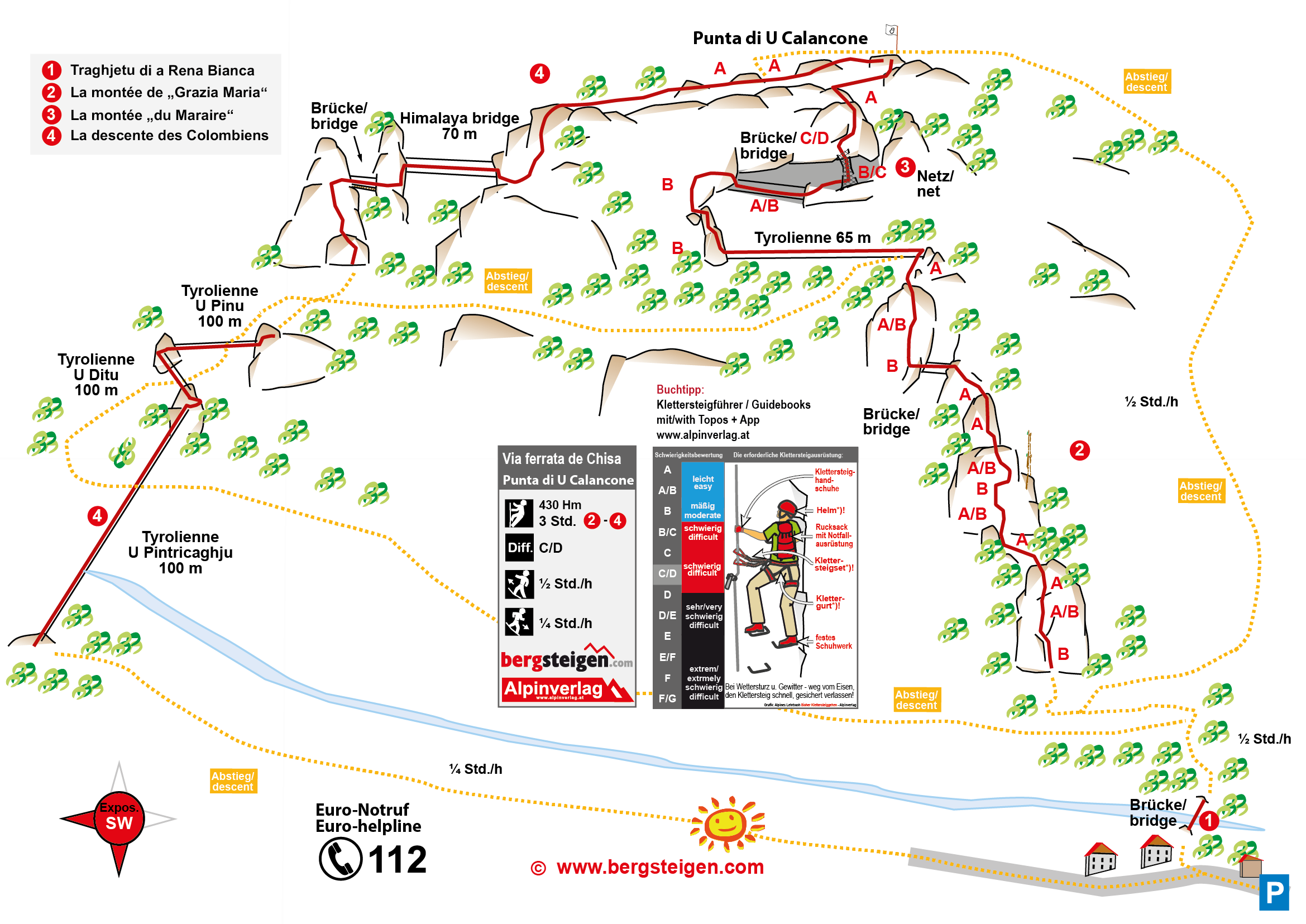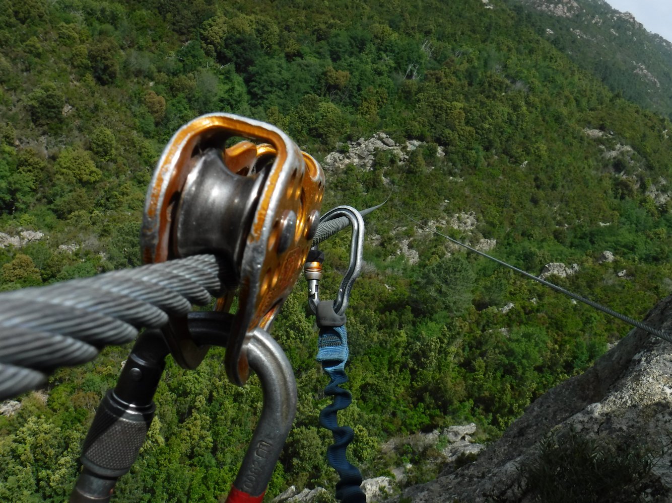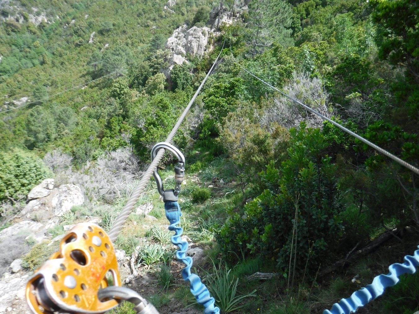 Secteur 2: La montée de “Grazia Maria”: Vom Felsfuß führt eine Eisenbügel-Reihe senkrecht hinauf zu einer 17 m langen 2-Seil-Brücke mit zusätzlichem Sicherungsseil darüber. Nordwärts klettert man weiter entlang der Felswand zur 65 m langen Tyrolienne mit einem Sicherungsseil rechts daneben, an welchem sich rot-schwarzer Hinweis “longe” befindet. Hier ist darauf zu achten, will man sich daran mit einem Karabinerseil sichern, dass dieses wenigstens 1,5 m lang ist, um die Reibung am dortigen Seil zu verringern, welche einen bei der Abfahrt eher ausbremsen würde. Ggfs. verlängert man sein Set-Seil mit einer Bandschlinge und zweitem (selbstsichernden) Karabiner. Am Landepunkt hängt ein dreieckförmiges grünes Fangnetz. Man kommt jedoch gar nicht bis dorthin, denn davor steckt am Rollseil ein Bremsseil mit Karabiner, welches unterm Seil verankert ist. Hier muß man beachten, dass dieses Bremsseil wie ein Katapult zurück wirkt. D.h. man muß sich am Rollseil festhalten, damit man nicht zurückrollt. Dann muß man in der Luft an der Rolle hängend sich um das Bremsseil umkarabinern. Handschuhe sind hier von Vorteil insbesondere dann, wenn die Rolle heiß geworden ist. Am Landepunkt hängt vorsichtshalber schon mal eine rostige Kombi-Zange …