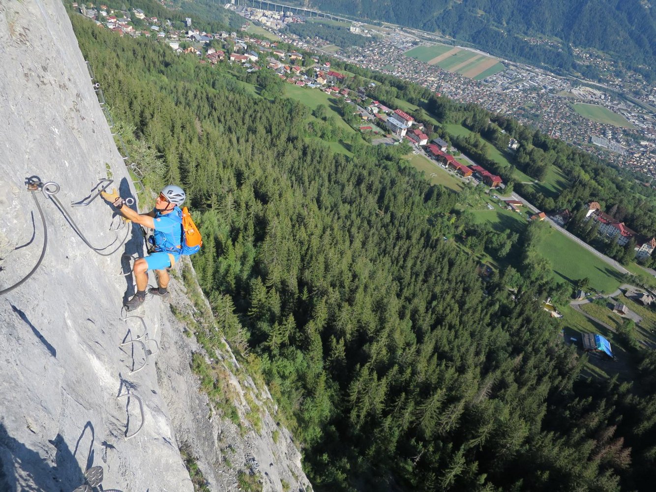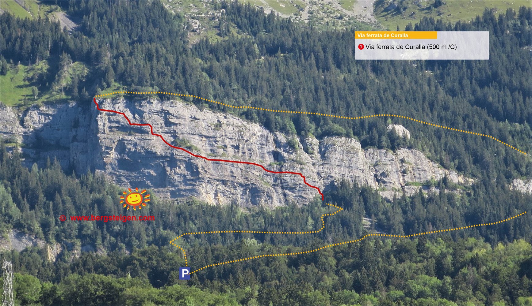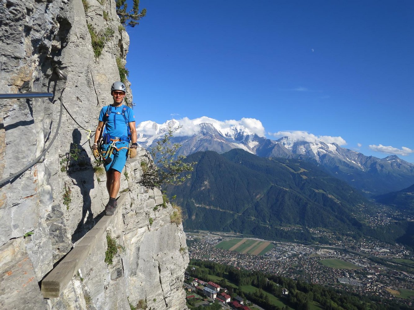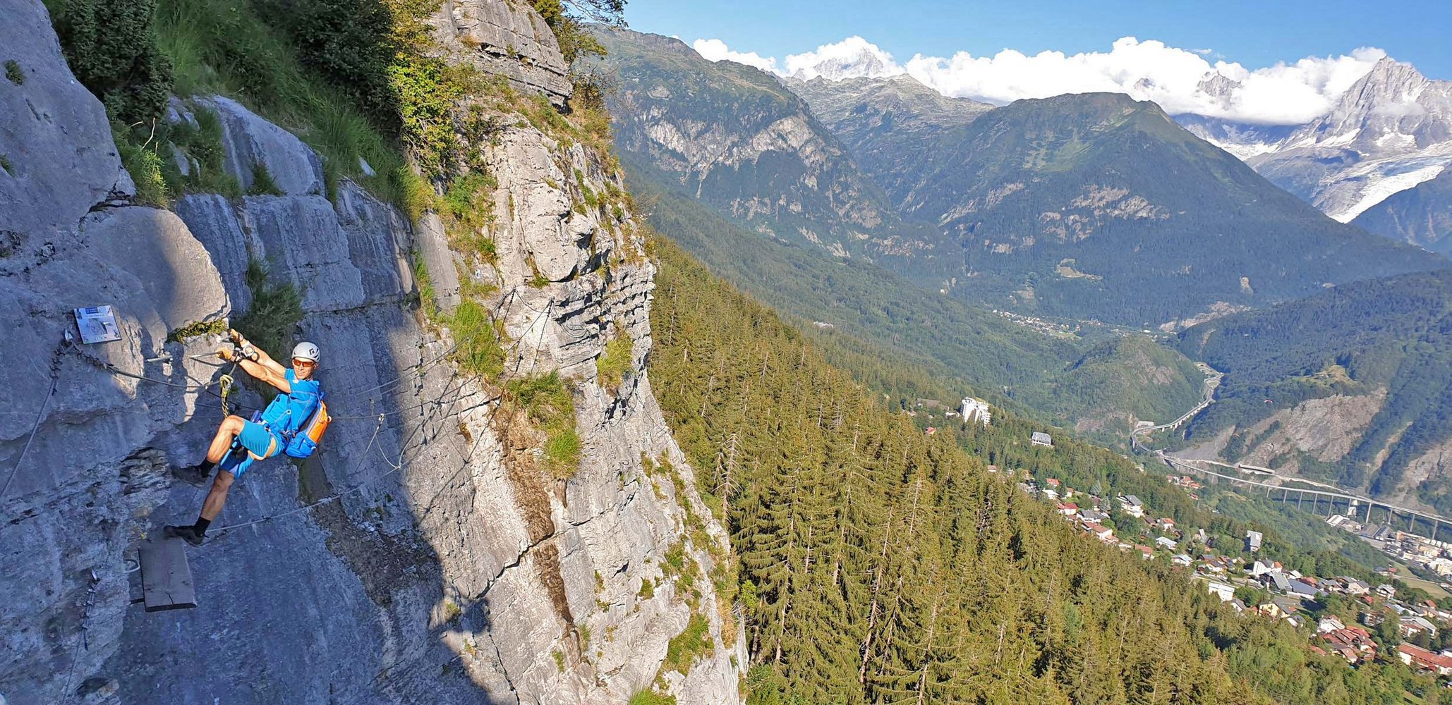 Die Via ferrata de Curalla quert an einer der vorgelagerten Felsklippen unter der Aguille de Varan. Der Steig bietet auf seinen rund 500 Metern Kletterlänge konstante Schwierigkeiten im Bereich B bis C und einen grandiosen Blick auf den Mont Blanc. Da kann man schon mal über den Umstand, dass der Steig schon sehr glatt-geklettert ist, hinwegsehen, zu erhaben blickt der höchste Berg der EU mit seinen riesigen Gletschern auf einen herab. Die Sonne tut es in dieser Südwand auch und zwar nahezu den gesamten Tag, deshalb bitte ausreichend Flüssigkeit in die Tour mitnehmen!