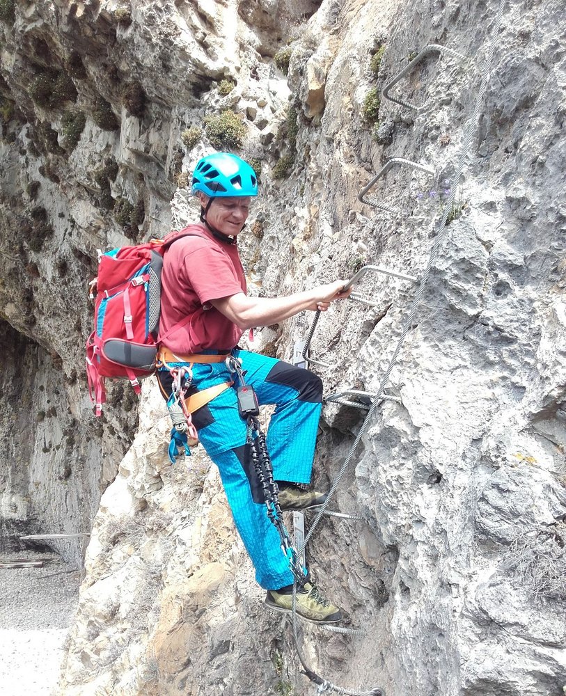 Klettersteigausrüstung, Helm, Doppelseilrolle (Petzl) für Tyrolienne und dicker Bremshandschuh!