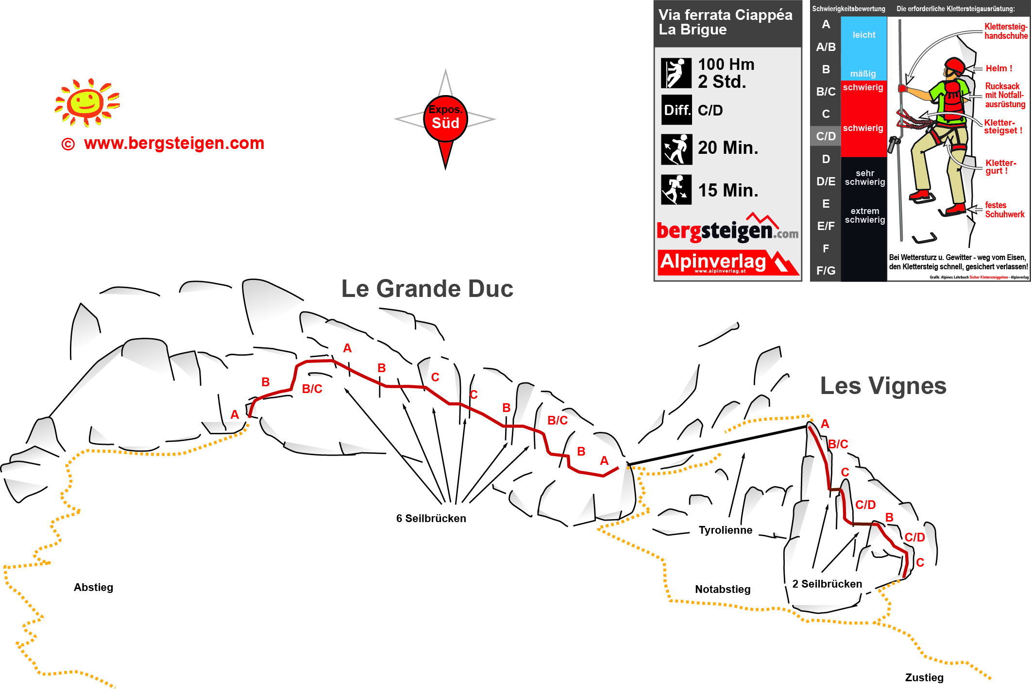 Die Via ferrata de la Ciappéa ist ein Klettersteig französischer Bauweise, d.h. viele Trittbügel und lockere Seile, da man sich in Frankreich ja nicht an den Seilen, sondern nur an den Bügeln und Felsen festhält. Herzstück des an den Ciappea-Wänden entlangführenden Steiges ist eine 150 m lange Tyrolienne, die man aber auch leicht umgehen kann. Die Hauptschwierigkeiten liegen am ca. 100 Meter hohen ersten Pfeiler - Les Vignes - mit zwei Seilbrücken. Die ca. 250 Meter lange Querung am Le Grande Duc ist deutlich leichter und hat sechs kurze Seilbrücken.