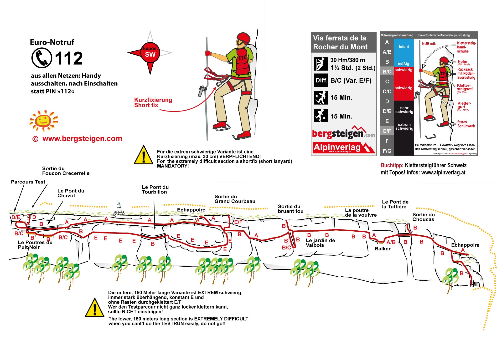 Wenn man dem Steig bis zum Ende, dort wo auch der Test Parcours für die darunter liegende Via ferrata de la Rocher du Mont - Variante Extremement Difficile ist, geht MUSS man, um bei der Schwierigkeit B/C zu bleiben, auf dem Steig wieder zurück gehen bis man vor dem Sortie du "Grand Courbeau" auf das Gipfelplateu des Rocher du Mont aussteigen kann. Der Ausstieg beim Test Parcours über die Leiter ist D!