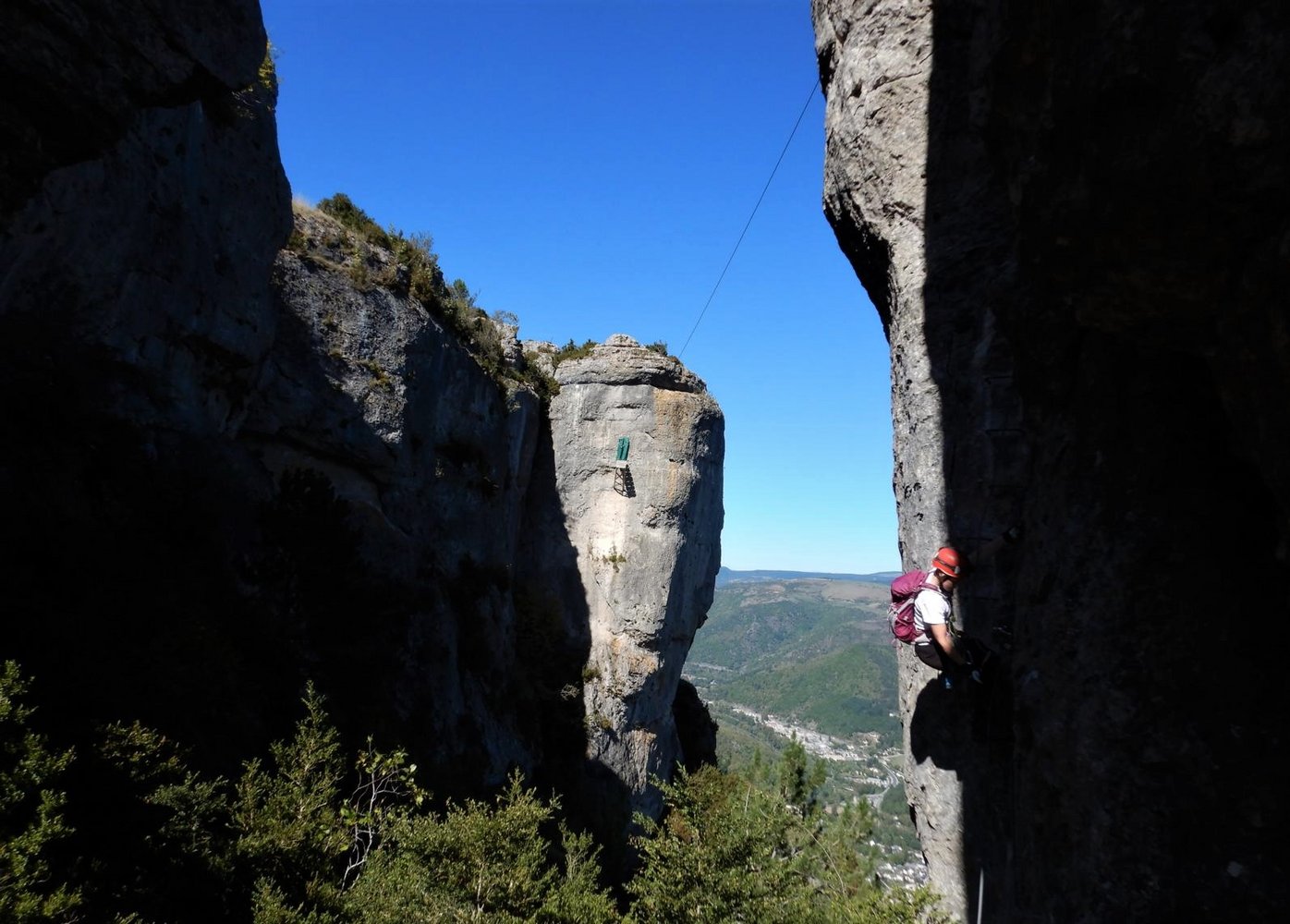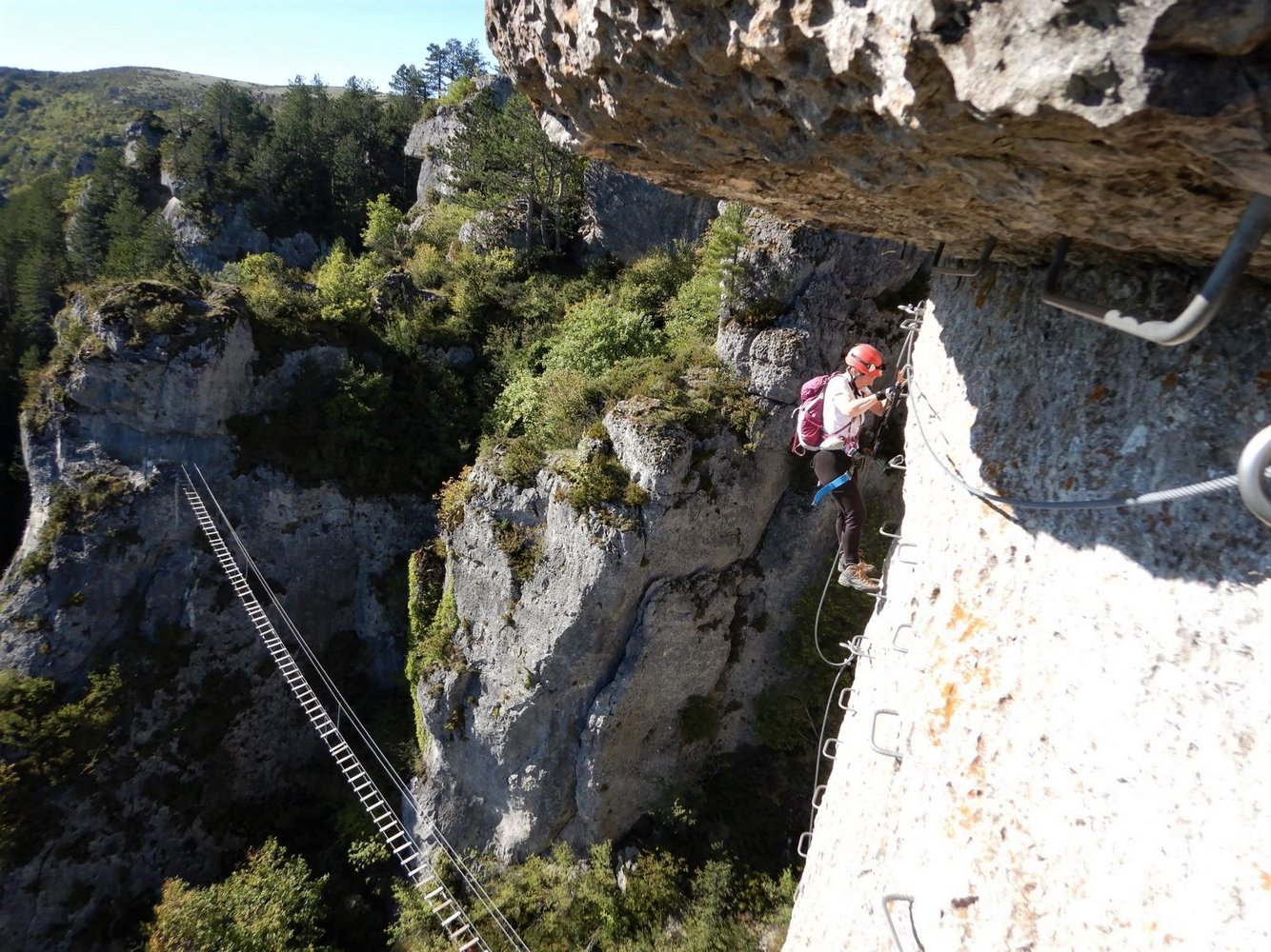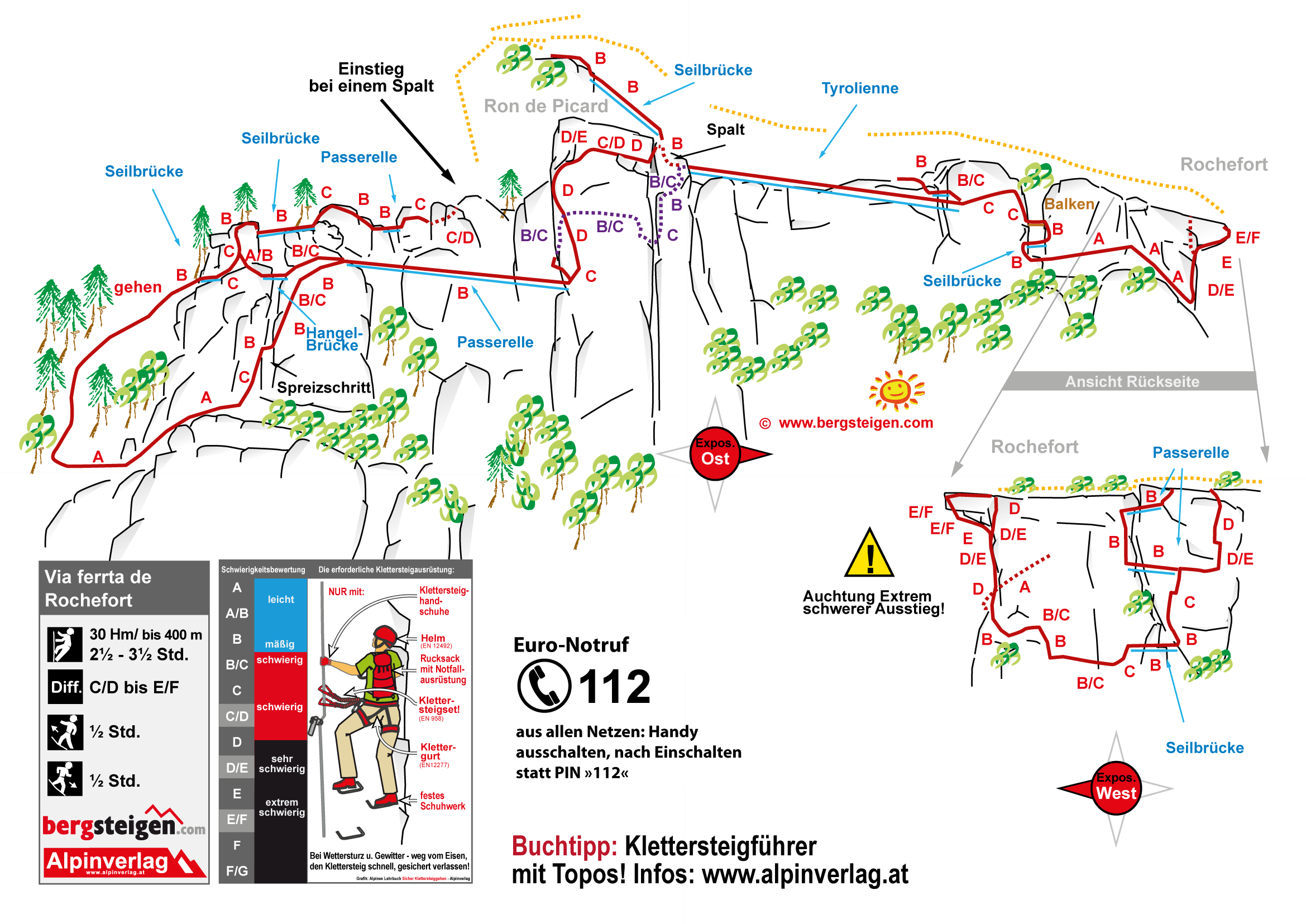 Der schwierigste Klettersteig in Frankreich stellt in der Variante am gewaltigen Überhang des Rochefort-Turms eine Herausforderung dar, die allerdings durch eine Vielzahl an Bügeln etwas entschärft wird. Darüber hinaus weist der KS eine Vielzahl an Seilbrücken, Passerelles und 1 Tyrolienne auf. Es gibt 2 vorzeitige Ausstiegsmöglichkeiten jeweils über eine Seilbrücke und 4 verschiedene Ausstiege nach Absolvierung des Gesamtparcours.
