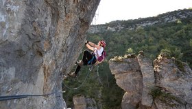 Der Einstieg in den E/F-Überhang von der Einquerung aus ist etwas kniffelig, der mächtige Überhang selbst ist aufgrund der vielen Bügel aber technisch nicht schwierig. Er erfordert - ohne Rastschlinge geklettert - aber eine enorme Kraftausdauer und Mut.