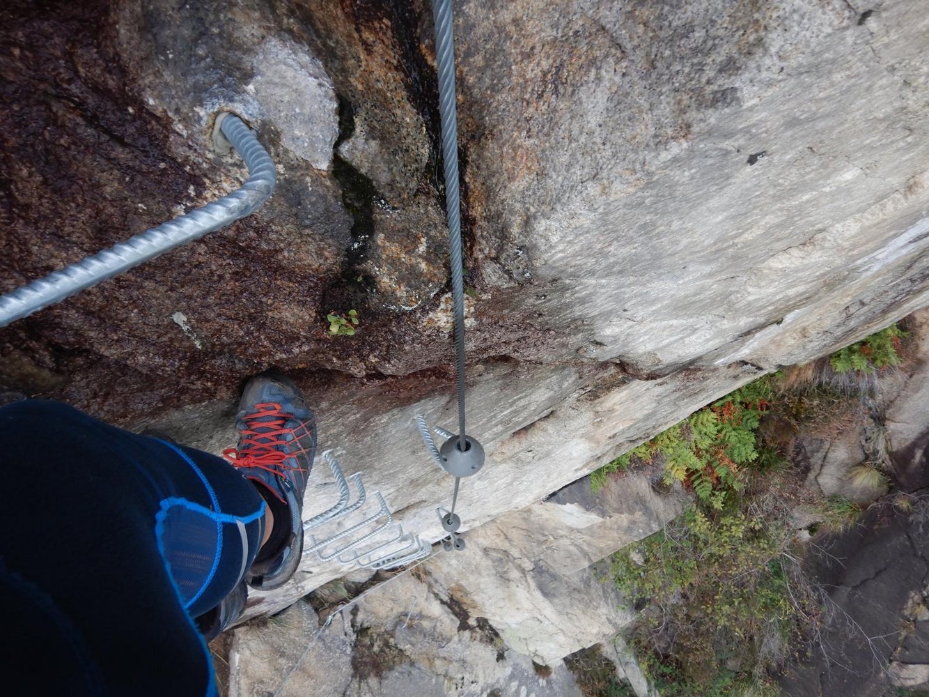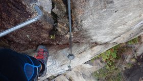 Im unteren Bereich dieses Klettersteiges muss man auf schönem Granit auf Reibung ansteigen. Die leicht überhängenden Steilwände weiter oben werden auf Bügelreihen überwunden, wobei in der Schlüsselstelle absichtlich 1 Bügel fehlt – an dieser Stelle muss man auf eine Felsleiste =Aufleger greifen (oder sehr verdreht mit 2 Händen ins Stahlseil)