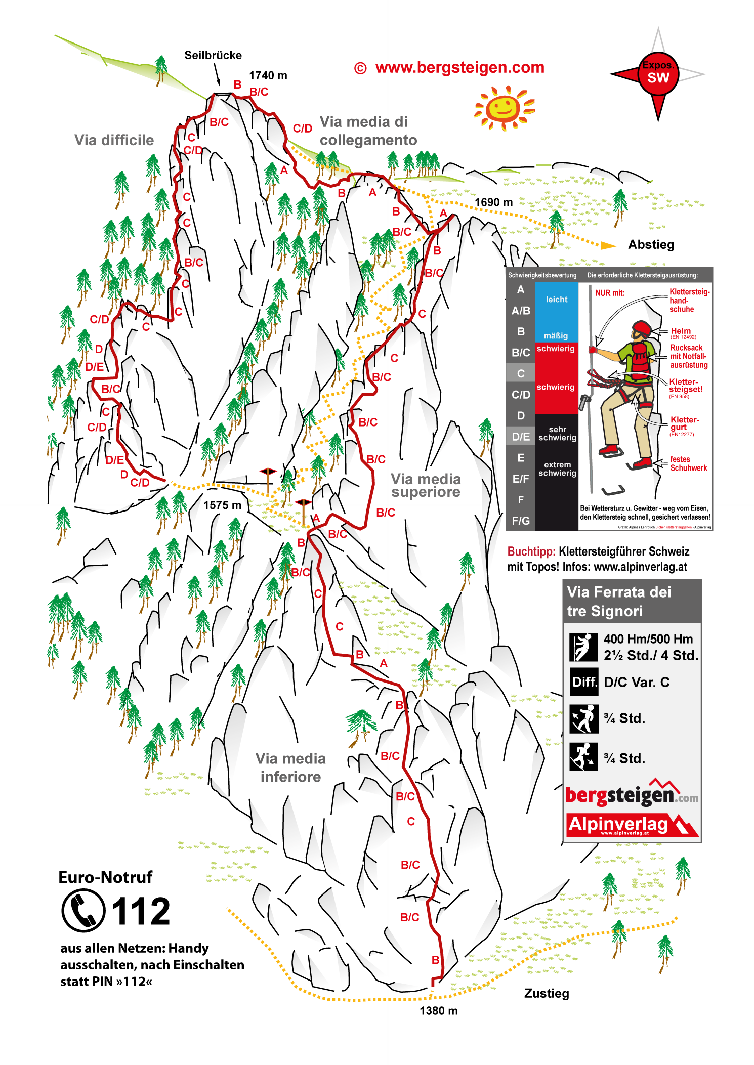 Wer alle Varianten (insgesamt 600 Hm Klettersteig) in ansteigender Schwierigkeit gehen möchte, wählt am besten folgende Runde: Via Media – Via Media di Collegamento – Sentiero di Collegamento – Via Difficile.