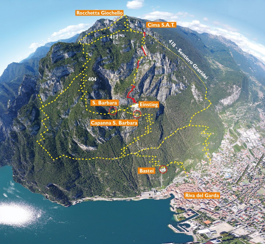Vom Gipfel kurz dem Grat folgen, dann sehr steil (B/C!; mit Seilen gut abgesichert) hinunter zu einer Scharte (in der Nähe ist ein Helilandeplatz). Von dieser kurz zu einem Wegweiser aufsteigen - ab dort zwei Möglichkeiten: a) Rechts immer durch sehr steilen Wald auf dem „Sentiero Grazidei“ absteigen und unten auf einem Forstweg zurück nach Riva bzw. zur Bastione (der steile Abstieg ist oben bei Nässe heikel!). b) Alternativ kann man bei der Kreuzung nach links abbiegen, es folgt eine weitere Kreuzung (rechts geht es zum R. Giochello). Man hält sich links auf dem Weg 413, später dann auf dem Weg 404 und erreicht wieder die Kapelle S. Barbara. Von dieser wie beim Zustieg hinunter nach Riva del Garda absteigen. Über den Rocchetta Giochello, 1519 m: Von der Kreuzung bei Var. b rechts zum Gipfel, von dort schöner Ausblick. Abstieg über den Sent. Rino Zanotti zur Bochet dei Concoli, dort links zum Weg 404, weiter wie bei Var. b) (Mehraufwand ca. 1½ Std.).