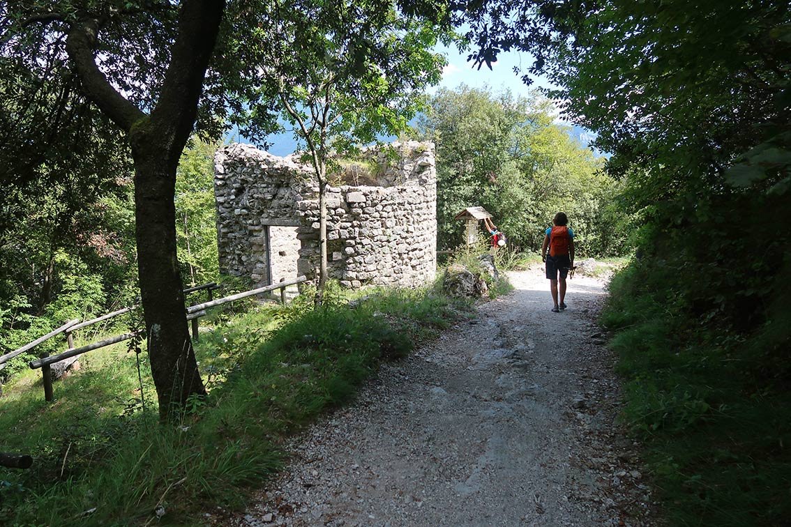 Bei einer großen Übersichtstafel an der Straße beginnt der anfangs gepflasterte Weg 404 zur Bastione (211 m). Von der weißen Festung auf dem Steig weiter bis zur Capanna (Hütte auf 560 m). Von der Hütte in Richtung Kapelle S. Barbara, vor einem Tunnelloch zweigt rechts der markierte Weg (404 B) zum Einstieg ab.