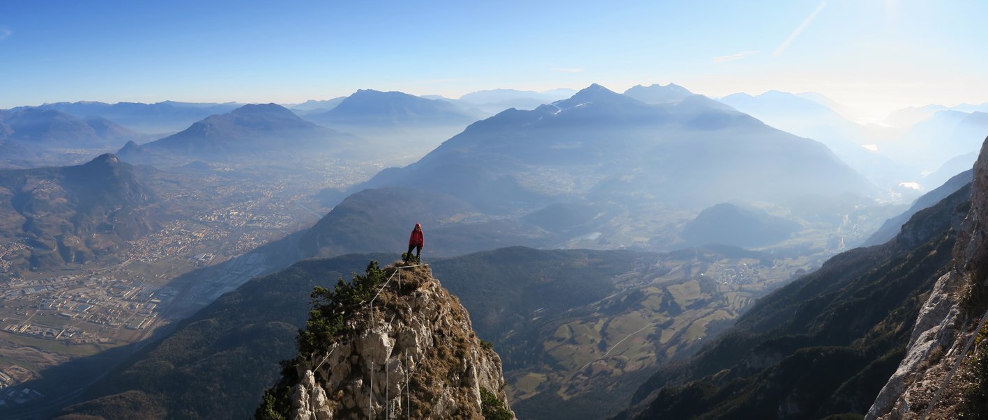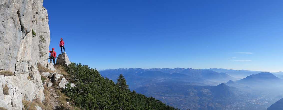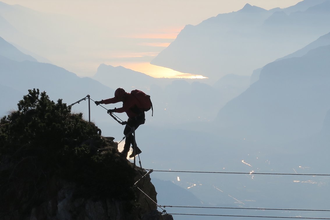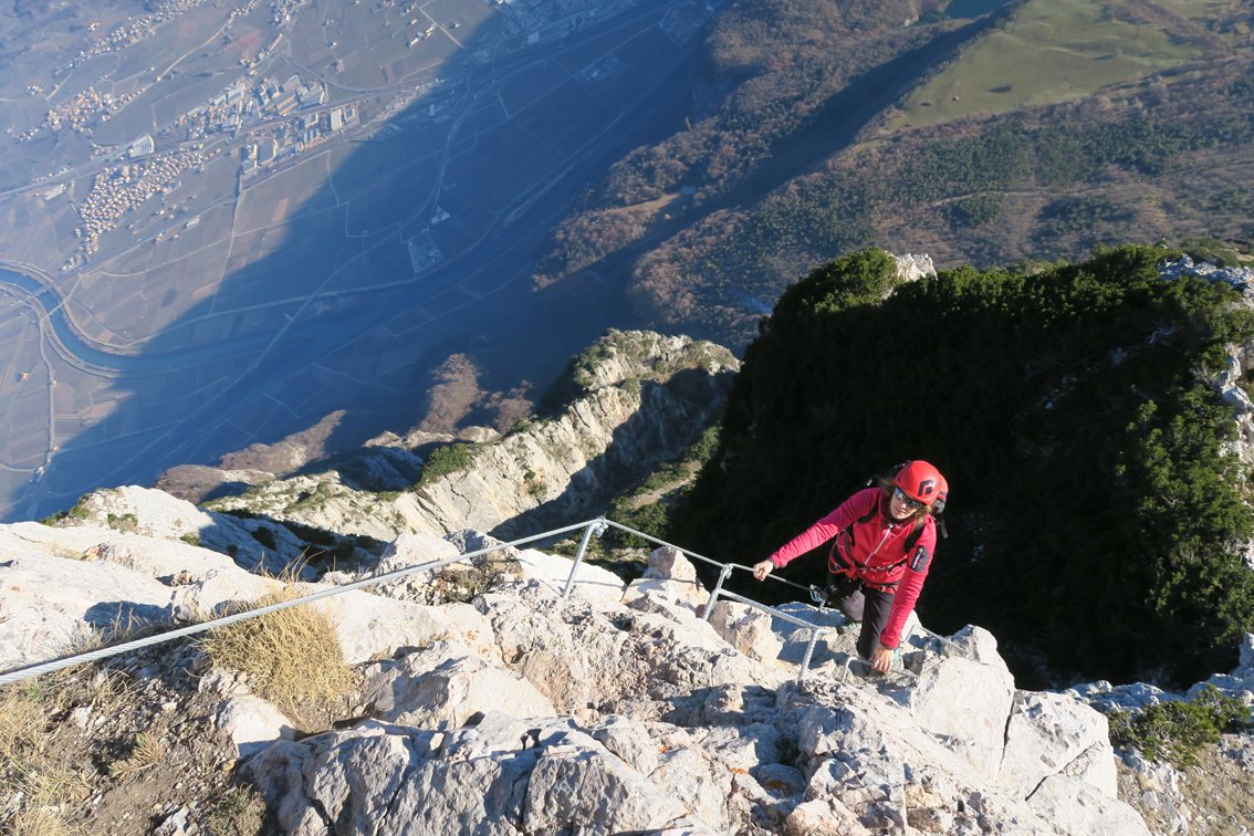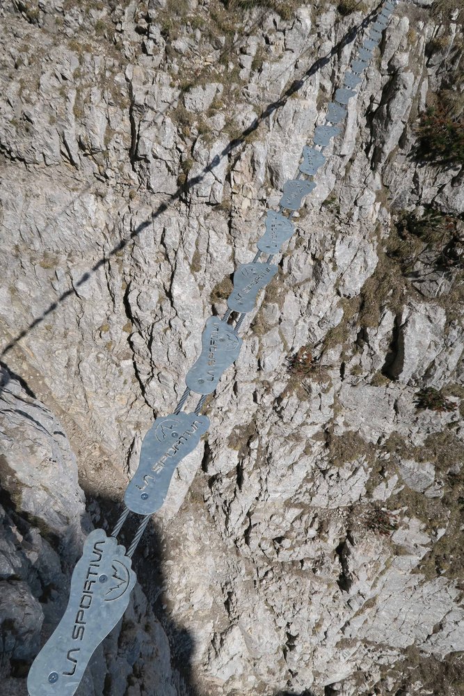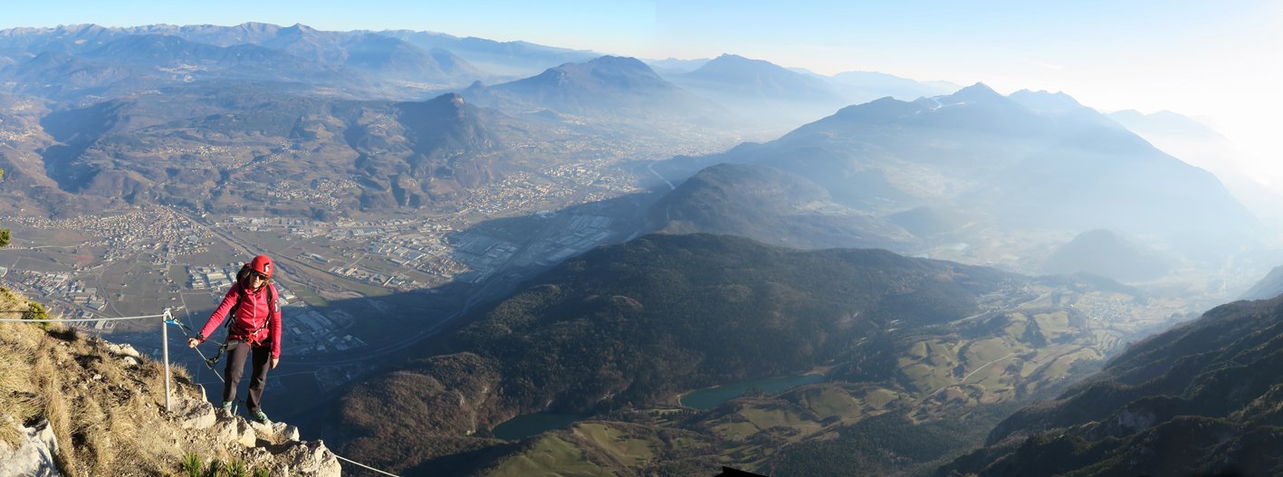 Gewaltig ausgesetzt quert man lange an der mächtigen Felswand der La Paganella - selten hat man bei einem Klettersteig solch tiefe Abgründe unter den Sohlen! Die Tour an sich ist mittelschwer, wenn jemand aber mit sehr ausgesetzten Passagen psychisch belastet ist, wird er sich vermutlich deutlich fester als nötig an das Stahlseil krallen. Eine schöne Klettersteigtour, die sowohl den Gardasee, die Brenta und die Stadt Trento als Landschaftskulisse zu bieten hat - ein schöner, langer und moderner Sportklettersteig nahe der Bergstation mit ausgesetzter Querungen und gewaltigem Tiefblick.