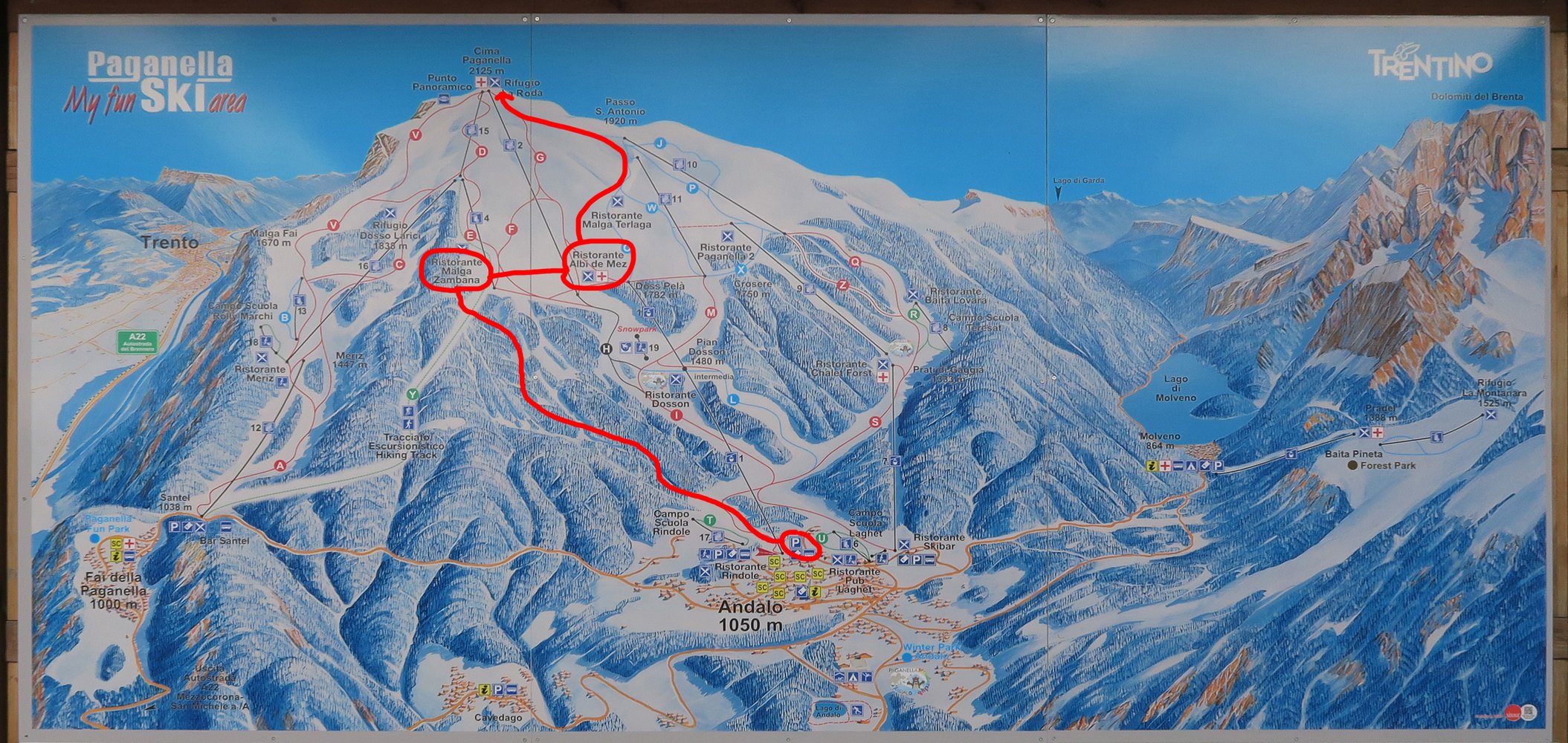 Auf der Autobahn bis San Michele all' Adige/Mezzocorona. Dort dann nach Mezzolombardo, nach dem Ort zweigt man links in Richtung Andalo ab. In Andalo zur Bergbahn und dort parken. Infos zur Seilbahn: www.paganella.net