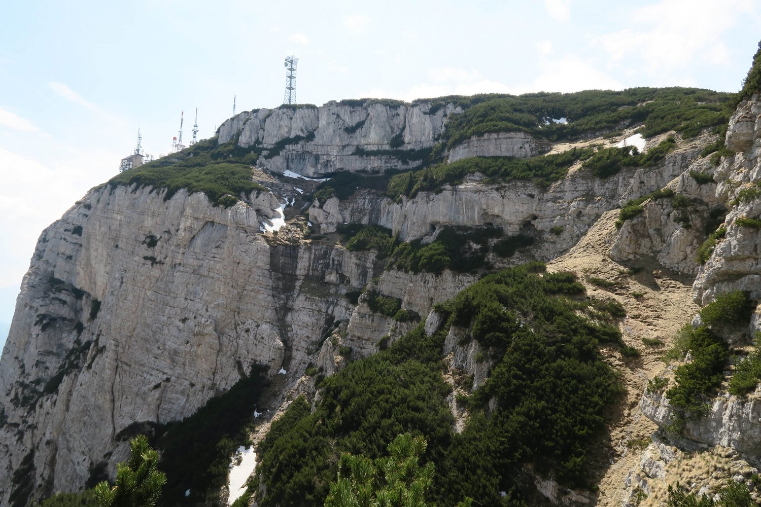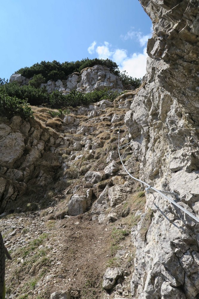 Vom Ausstieg entlang der Kante (Weg in den Latschen ausgeschnitten) zurück zur Scharte und von dort auf der Piste hinauf zur Bergstation.
