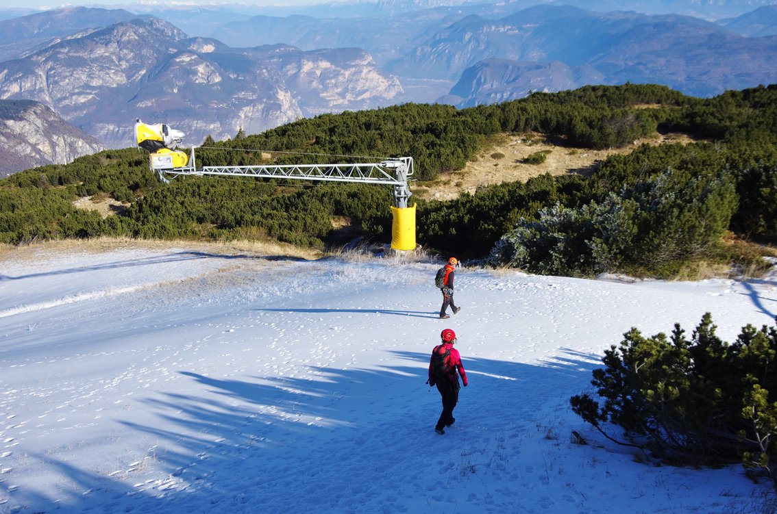 Als Alternative zur Seilbahnfahrt bietet sich der Aufstieg von Terlago an. Man folgt dem Weg 606 bis kurz vor den Paso San Antonio und zweigt dann rechts zum La Roda Gipfel ab (gesamt kommt der Tag dann auf 1600 Hm). Der Fußaufstieg von Andalo durch das Skigebiet ist etwas kürzer - ca. 1000 Hm/2- 2,5 Std. Man kann auch mit dem MTB bis zum La Roda Gipfel hinauf fahren. Achtung: Bei Nässe ist vor allem der erste Teil sehr unangenehm. Im Frühjahr sollte man die Schneelage in der Wand (am besten vom La Roda Gipfel aus) checken.