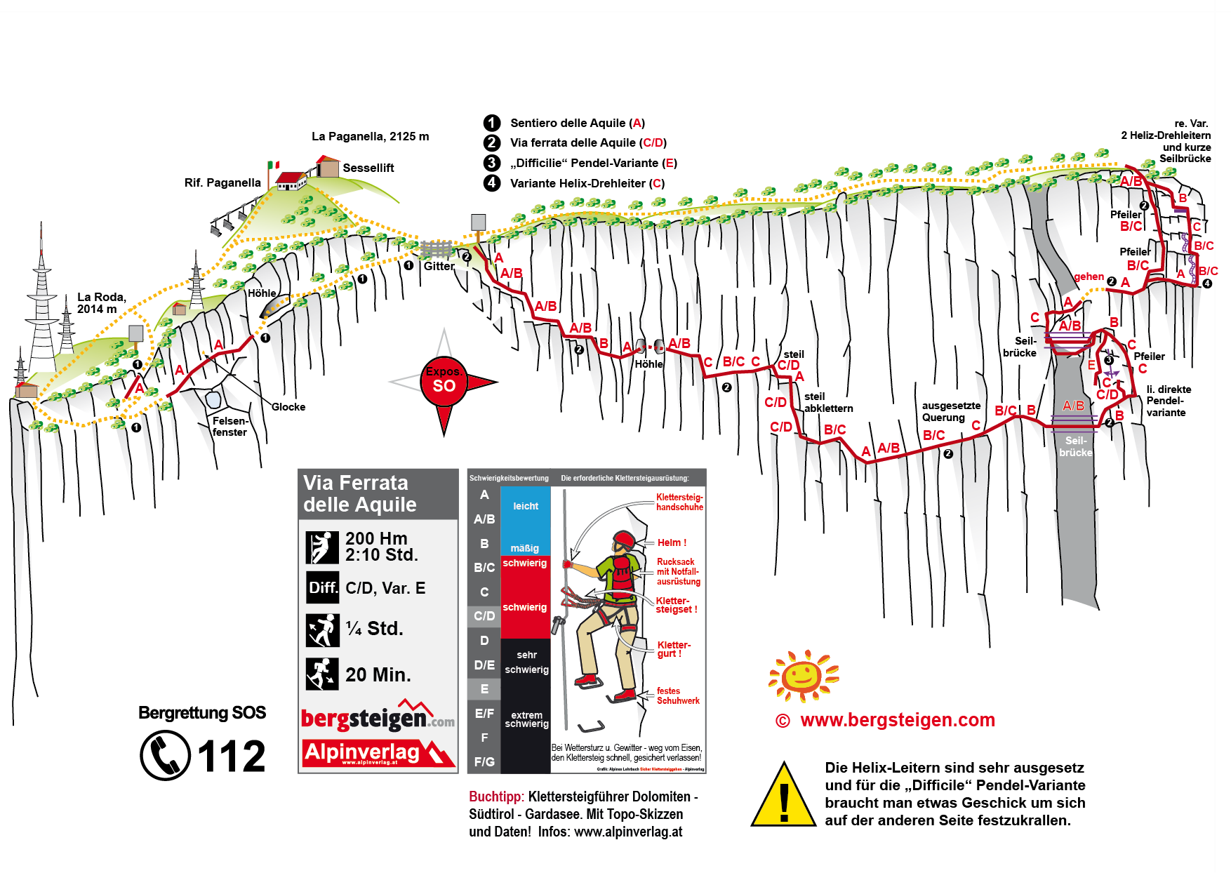 Siehe Topo. Die schwersten Passagen sind die Abkletterpassagen im Mittelteil (C/D), die ausgesetzte Querung (B/C und C) an sich und der letzte Pfeiler (B/C) sind nicht mehr so fordernd. Ganz am Ende gibt es seit 2017 eine Ausstiegsvariante (C) mit 2 Helix-Drehleitern und einer kurzen Seilbrücke. Zwischen den Seilbrücken gibt es eine kurze, extreme Variante mit Pendel (E): Zuerst klettert man kurz vertikal bis zum Pendel (C/D). Man sollte sich möglichst hoch einhängen, dazu benötigt man einen Schraubkarabiner oder 2 Expressschlingen (der vorhandene Karabiner ist nämlich nicht öffenbar; Stand Juni 2020). Dann läuft man an der Wand hin und her, bis man genug Schwung für den Sprung zum gegenüberliegenden Stahlseil hat (C). Darüber beginnen erst die klettertechnischen Schwierigkeiten. Zuerst vertikal D/E, dann über einen ganz kleinen Überhang (E), darüber dann leichter (D und C) hoch zur Seilbrücke des normalen Klettersteiges.