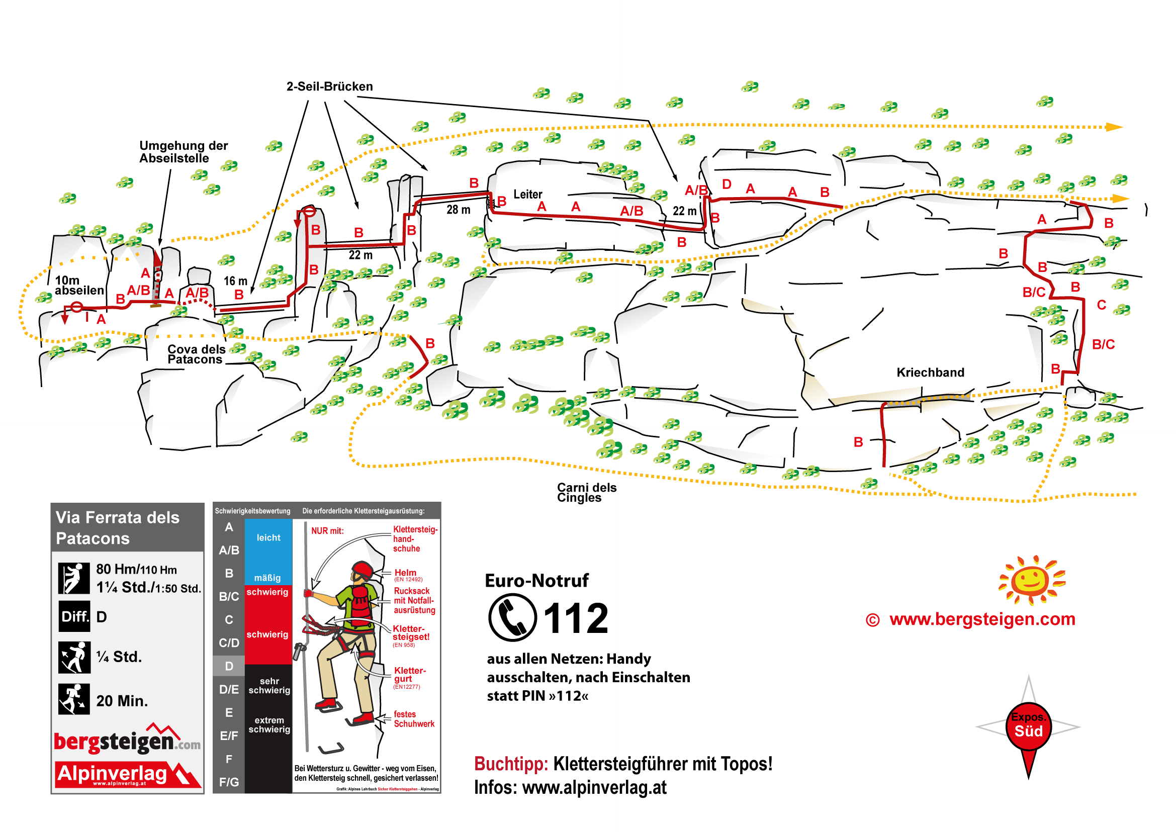 Alternativ (vom Autor nicht gemacht, aber im Internet recherchiert) nach dem Felsspalt links. Wir passieren den Endpunkt der Abseilstelle vom Klettersteig und gehen durch die Cova dels Patacons weiter, bis uns rechts ein kurzes Stück Klettersteig (B) über Grau de Latrencanous den Weg nach unten absichert. Dann links halten, bis wir auf den bereits bekannten Hinweg treffen.