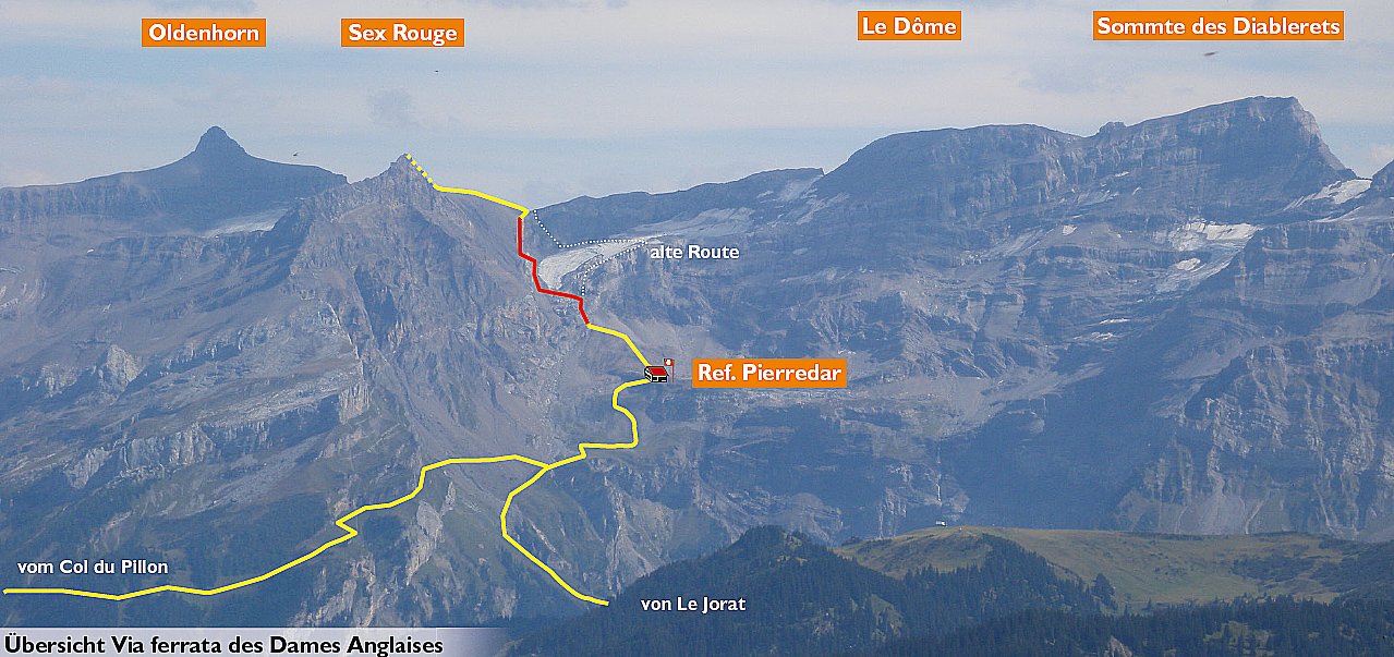 Auf dem weiß/rot/weiß markierten Sentier Prapio über Creux de Champ hinauf zum Refuge de Pierredar (3 Std., 1100 Hm). Dorthin gelangt man auch vom Col du Pillon über den Sentier Drudy (blau/weiß/blau) in 4½ Std., 800 Hm. Das ist zwar länger, doch kommt man bei Anreise mit dem PKW und Seilbahnbenützung wieder zum Ausgangspunkt zurück. Vom Refuge über ein Geröllfeld nach Osten hinauf zur ersten Felsstufe.