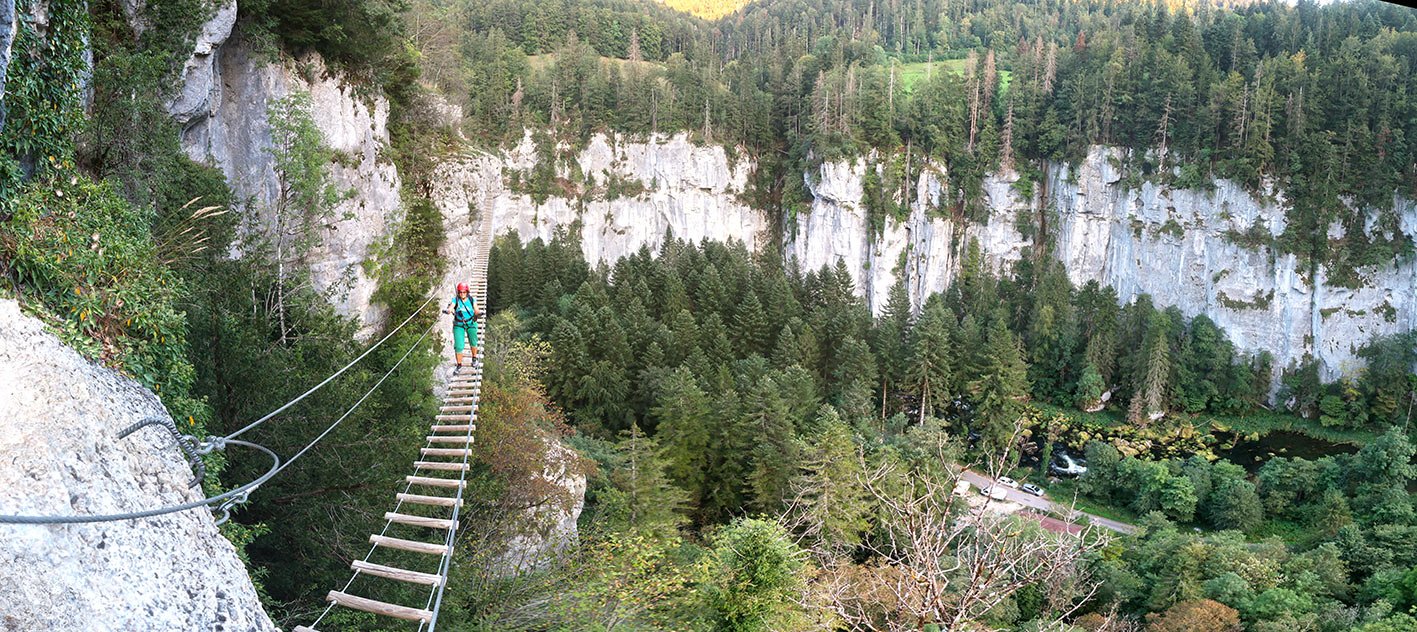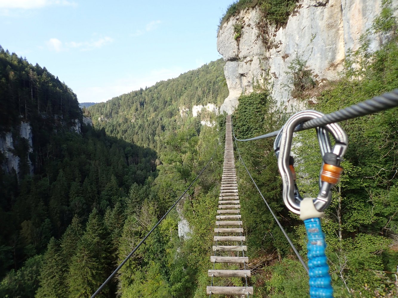 Die Ferrata des Echelles de la Mort ist ein schöner und abwechslungsreicher Klettersteig mit Klettergarten-Elementen (Holz-Steigbäume, Holzstege). Es gibt zwei sehr lange Seilbrücken und eine lange, ausgesetzte Tyrolienne (eigene Rollen nötig) am Ende der Ferrata. Aber auch, wenn man die Tyrolienne am Ende auslässt, hat man einen sehr langen, landschaftlich eindrucksvollen Klettersteig zu begehen. Viele Auf- und Ab-Passagen und lange Querungen erfordern bei einer Gesamtlänge von ca. 600 Klettermeter doch etwas Kondition. Wer in der Gegend ist, sollte sich die "Todesleitern" oberhalb des Le Doubs Flusses nicht entgehen lassen.