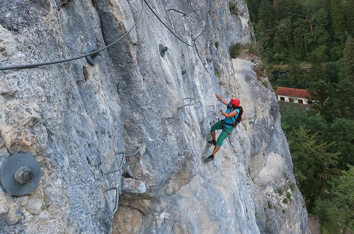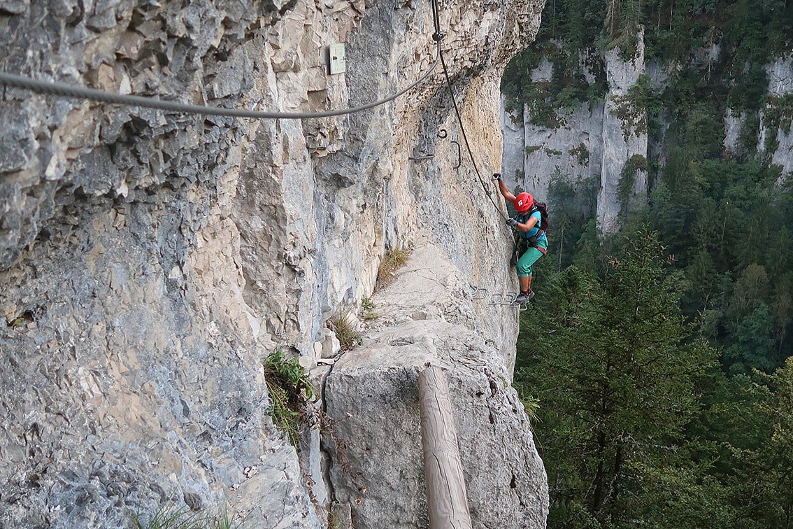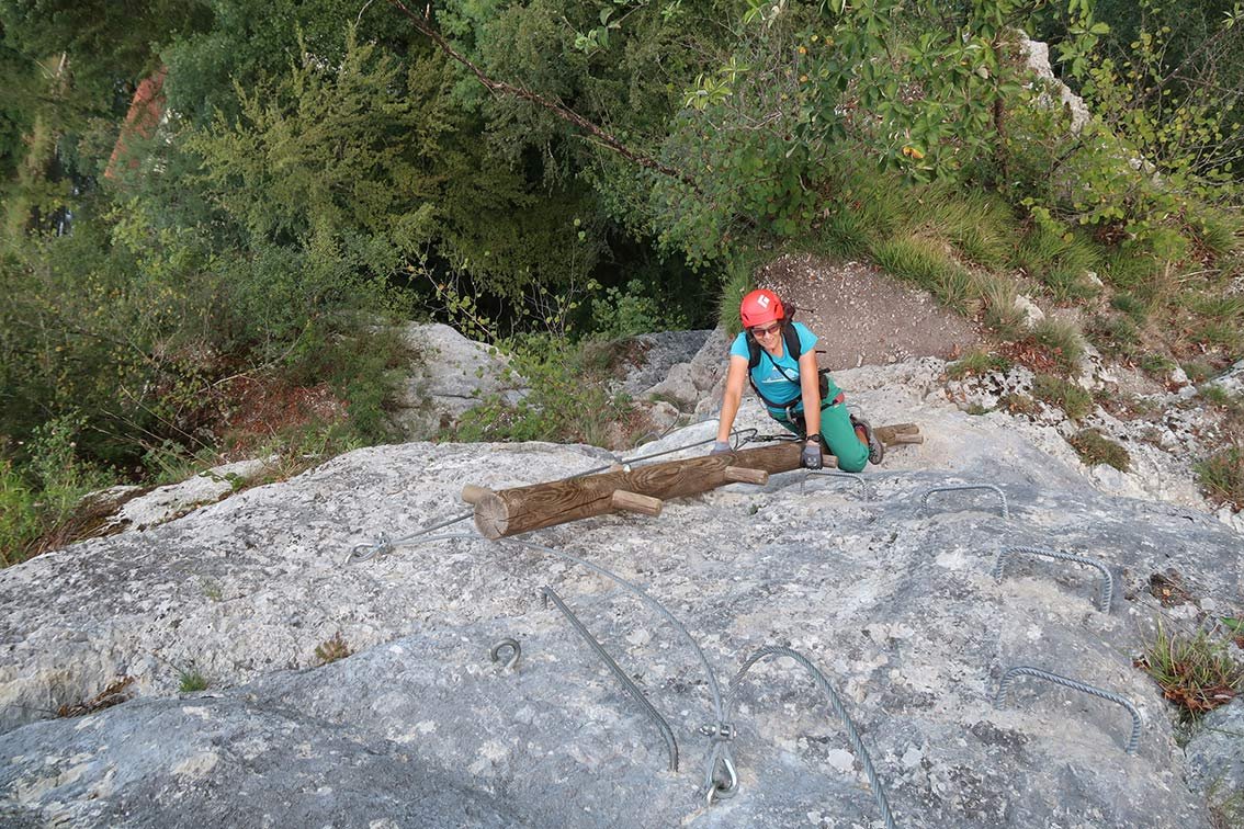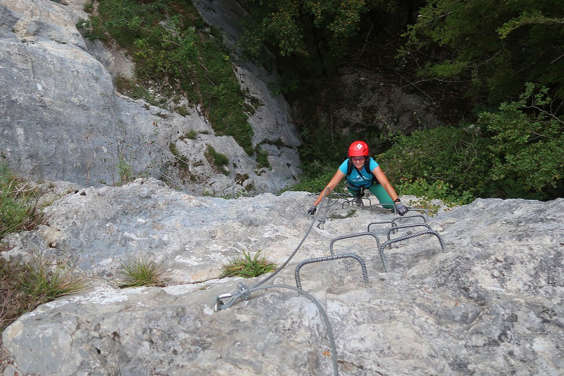Gut gesichert in typisch französischer Bauart: Durchhängende Sicherungsseile, dafür jede Menge Tritthilfen und Halteklammern.