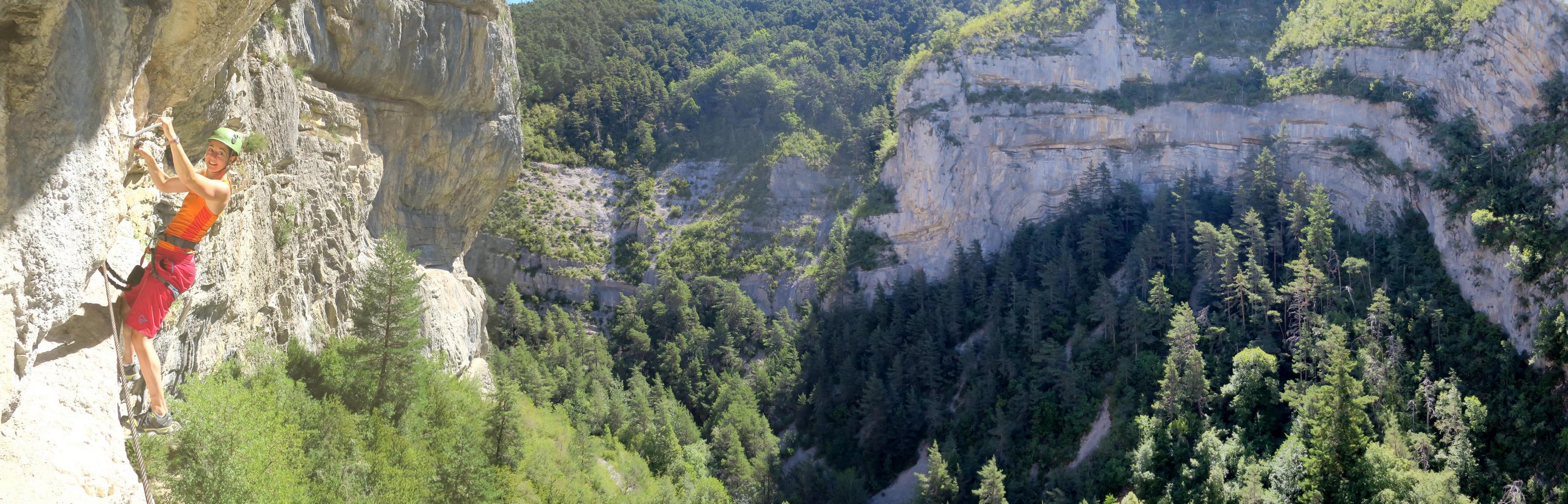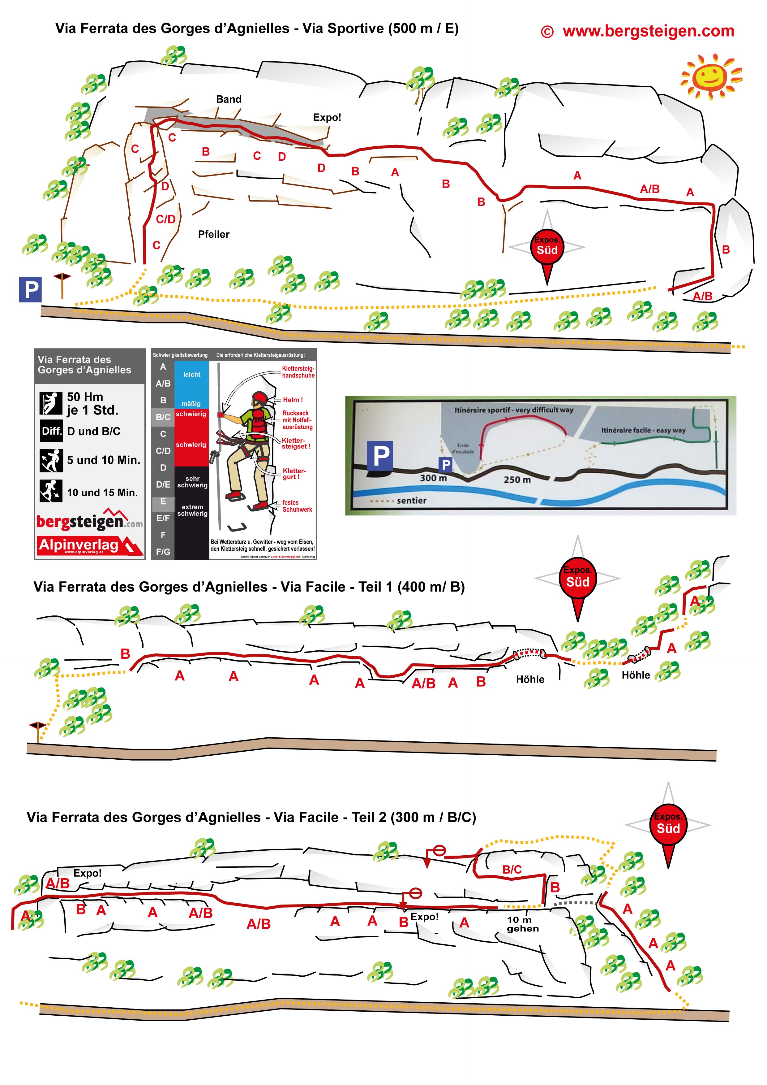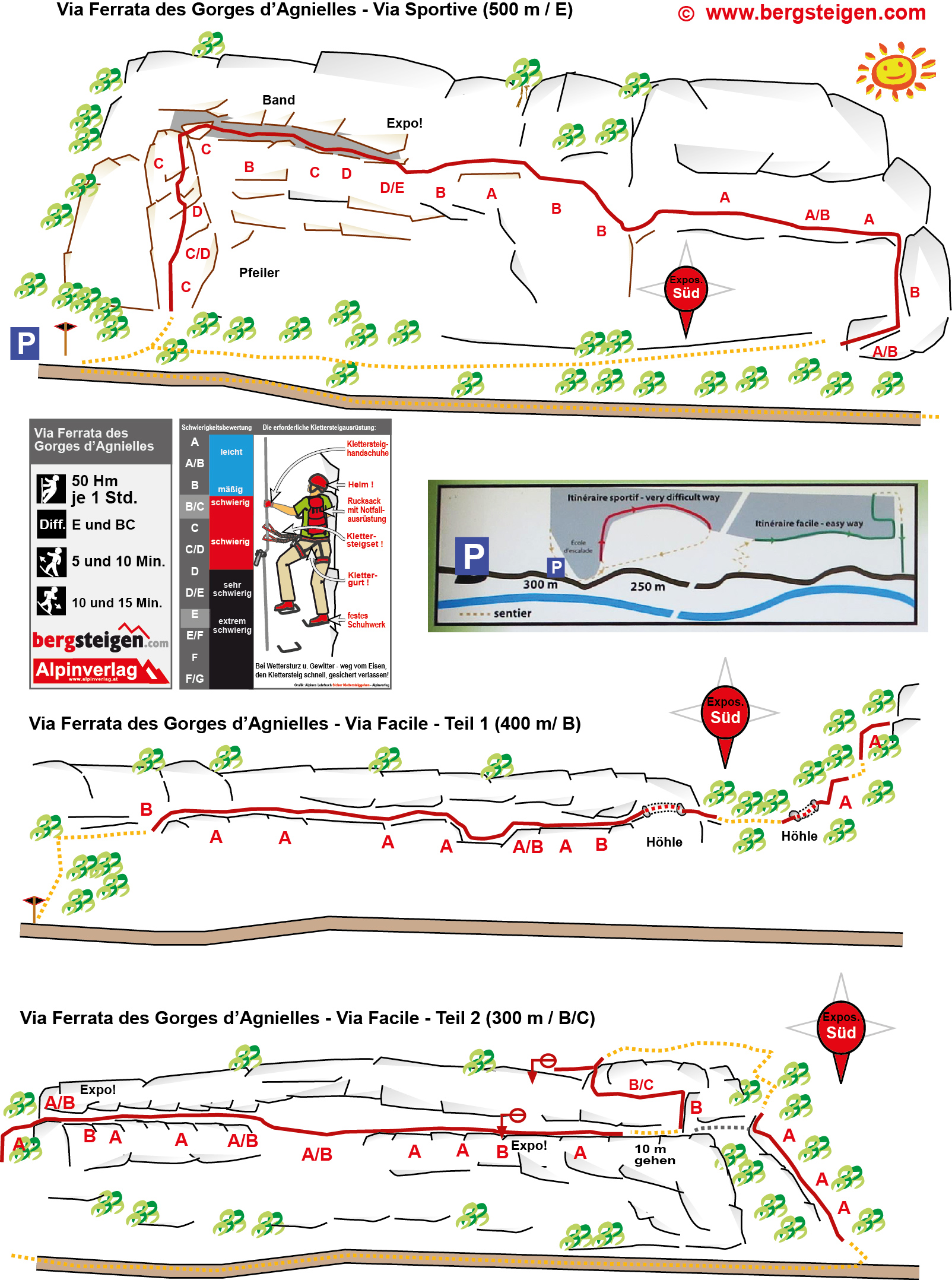 Das Tal der Gorges d'Angielles bietet neben viel Ruhe und einem malerischen kleinen Fluss in dem man im Sommer baden kann, zwei tolle Klettersteige. Die beiden Ferratas queren die niedrigen Felsen über dem Fluss auf Bändern und sind von französischer Bauweise. Zu Beginn wartet die Via Sportive mit 500 m anstrengender und auch teils sehr ausgesetzter Kletterei auf, um dann, wenn man noch möchte, von der Via Facile, die auf 800 m schönen Bändern folgt und erst am Ende ganz kurz etwas schwieriger wird, abgelöst zu werden.