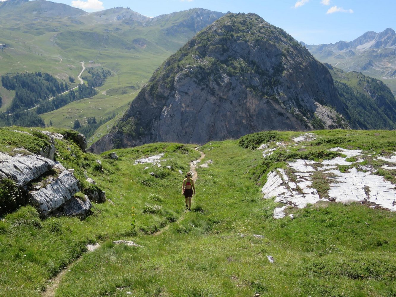 Vom Ende der Versicherung dem Pfad über Wiesen zum Gipfel der Plates de la Daille folgen und rechtshaltend über Wiesen absteigen, bis man auf einen weiteren Wanderweg trifft, dem man zurück nach Val d'Isere folgt. (Siehe Topo!).