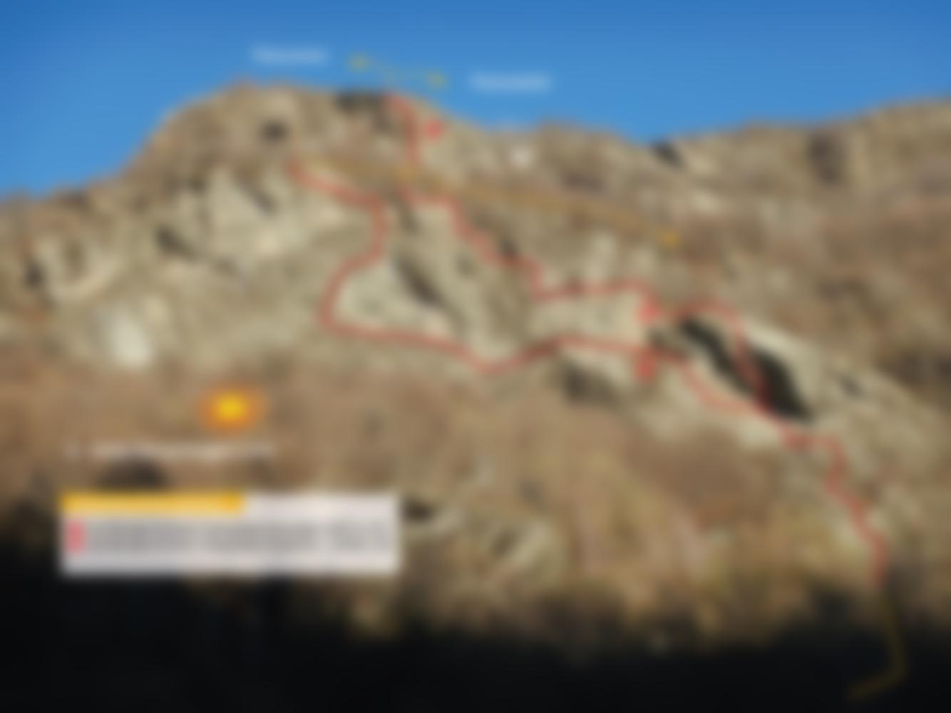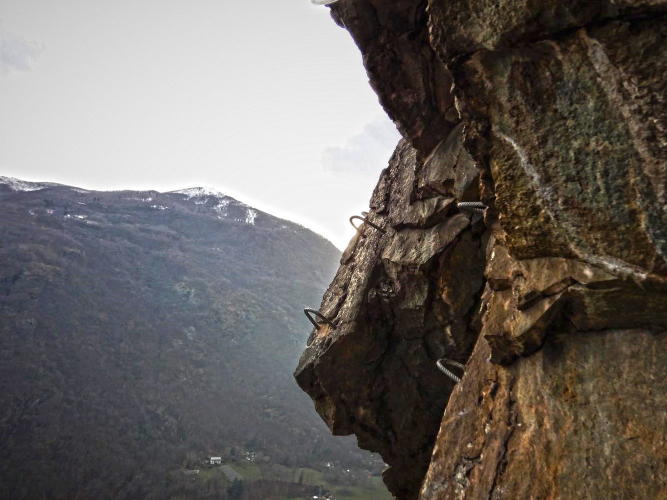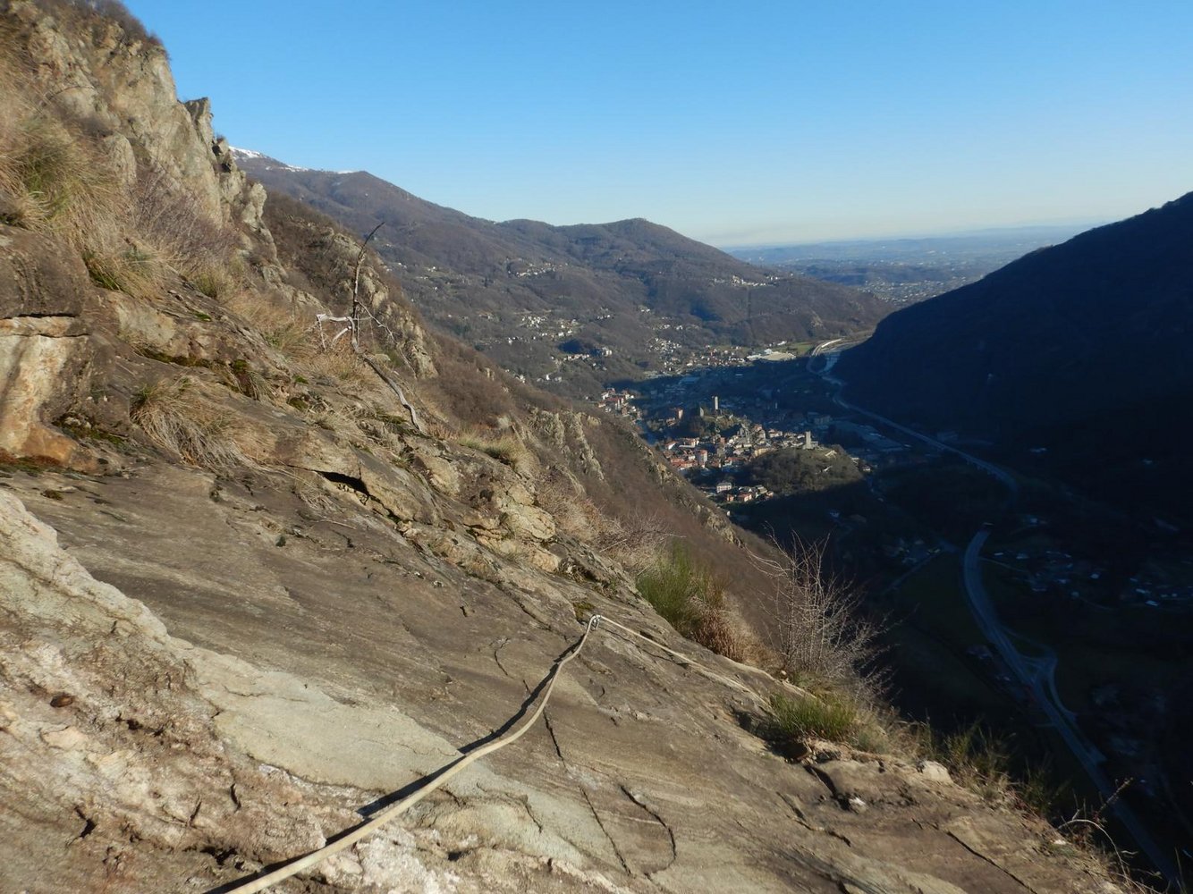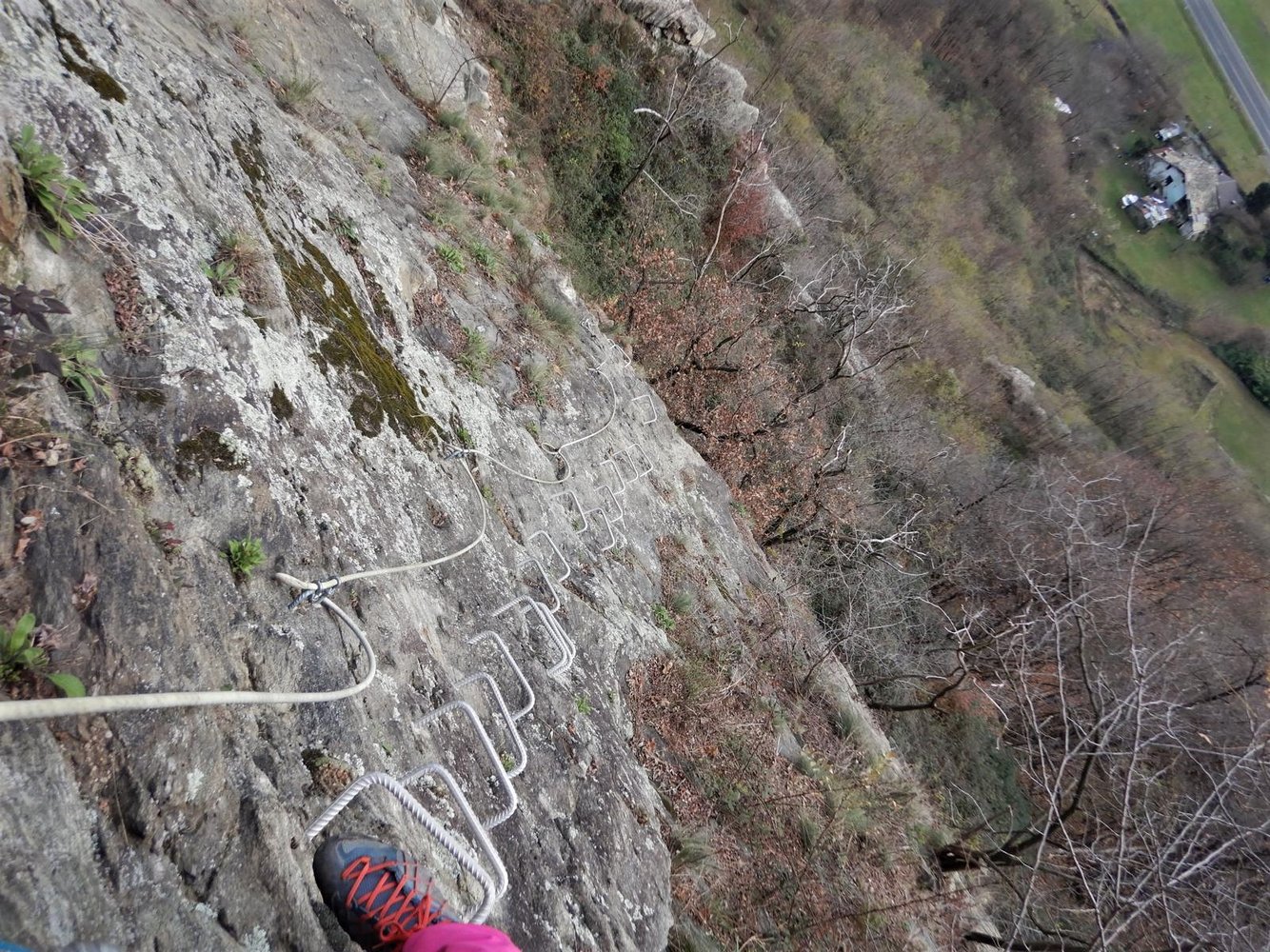 Der Beginn ist einfach, teilweise mit Bügeln – teilweise am Fels meist bis B, mit tollem Ausblick auf die Burgen von Pont Canavese. Nachdem nach rechts oben die extrem schwierige Variante SUPERIORE E abgebogen ist, durch eine längere Bügelwand. Danach immer wieder mit Bügeln über positiv geneigtes Gelände bis zur unteren Seilbrücke (die obere gehört zur Variante SUPERIORE). Die ist außerordentlich stabil durch ein doppeltes Unterseil – könnte aber auch umgangen werden. Danach Querung zu mehreren Bügelaufschwüngen, auch mit Mini-Überhängen bis C. Ganz viele Bügel leiten zum Ausstieg aus Teil 1 (ca. 1,5h ab Einstieg).