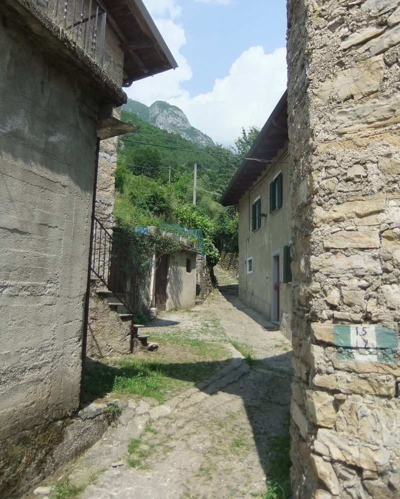 In der Linkskurve befinden sich Wegweiserschilder. Anfangs folgt man dem Weg Nr. 15 (Rif. Bietti), bzw. 17 (Calivazzo, bzw. Bocch. Di Prada) durch enge Gassen der Bergsiedlung. Dabei biegt man rechts ab in die Via Santa Maria. Nun auf einem Wegstück, das auch dem historischen Pfad „Resistenza “ identisch ist (grüne Schilder), Richtung Santa Maria (braunes Schild). Auf steinigen Stufen führt breiter Weg zur Gabelung und biegt dort links ab auf den Weg Nr. 17A. Der Hohlweg führt zum Abzweig von Weg Nr. 17B nach Zucco di Tura. Auf rot-weiß markiertem Weg Nr. 17B gelangt manzu einer Hanglichtung mit einer Bauruine und zu nächster Weggabelung herauf, wo man sich rechts hält (17B) zum Zucco di Tura.(1045 m).