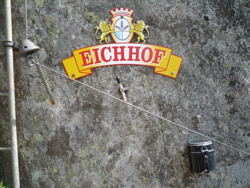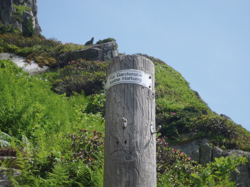 Kurz nach dem Einstieg folgt die Prüfstelle, eine glatte, aber leichte Platte (B). Danach klettert man über den rassigen (B/C) Einstiegspfeiler hinauf zu einer schönen Plattenzone. Diese Platten sind wegen der vielen Trittstifte erstaunlich leicht (A/B) zu überwinden. Es folgt ein Zickzackstück zu einer ansteigenden Rampe (bis B), auf der man die erste Matte (Wiese oder Grünfl äche) erreicht. Auf der Wiesenmatte leicht kurz nach links bis zum nächsten plattigen Felsriegel und im Zickzack (bis A/B) hinauf zur großen Terrasse mit Bank und Marterpfahl. Es folgt ein genialer Plattenpanzer mit vielen Trittstiften (A) und danach eine ansteigende Linksquerung in eine Rinne (A/B), an deren Ende sich ein am Fels montierter Bierhahn befindet. Leider ohne Stärkung geht es hinauf zum letzten Band (A), von dem eine kurze, senkrechte Leiter zum Ausstieg in der Nähe einer Fahne führt.