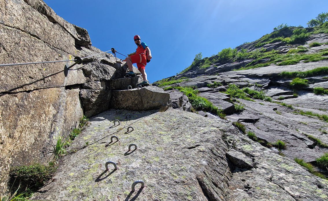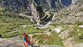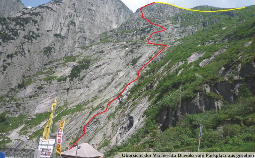 Ferrata Diavolo -beim Bau der Teufelsbrücke sollen die schlauen Urner den Teufel ausgetrickst haben. Das Kompetenzzentrum Gebirgsdienst der Schweizer Armee ließ sich beim Bau des Teufelssteiges jedoch auf keinerlei Mauscheleien ein und so fehlt am 700 m langen Steig oberhalb der Brücke rein gar nichts. Eine Dropout-Stelle zu Beginn wehrt Halbschuhtouristen ab, Sitzbänke sorgen für bequeme Rastmöglichkeiten und die nötige Erholung. An der Wand gibt es 350 Trittstifte, 700 m Stahlseil, 185 Verankerungen und zwei Leitern. Wer sich oben auf dem Steig am Zapfhahn das versprochene Bier zapfen möchte, braucht übermenschliche Hilfe. Der Steig zieht direkt beim Suworow-Denkmal, das an eine erbitterte Niederlage der Grande Nation erinnert, über einen glatten und etwas grasdurchsetzten Granitplattenpanzer hinauf zur Schweizer Fahne.