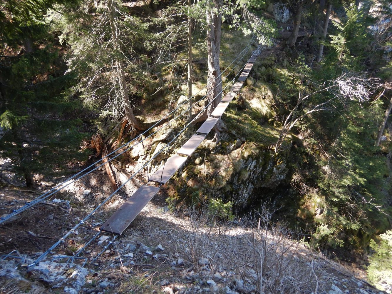 Der Klettersteig wechselt zwischen den Felswänden einer engen Schlucht hin und her mit einer Abfolge von Nepal- und Seilbrücken. Im Mittelteil des KS, zwischen den 2 Notausstiegen, befindet sich aber auch ein anspruchsvollerer und ausgesetzter Kletterteil. Die Ferrata endet genau am Parkplatz.