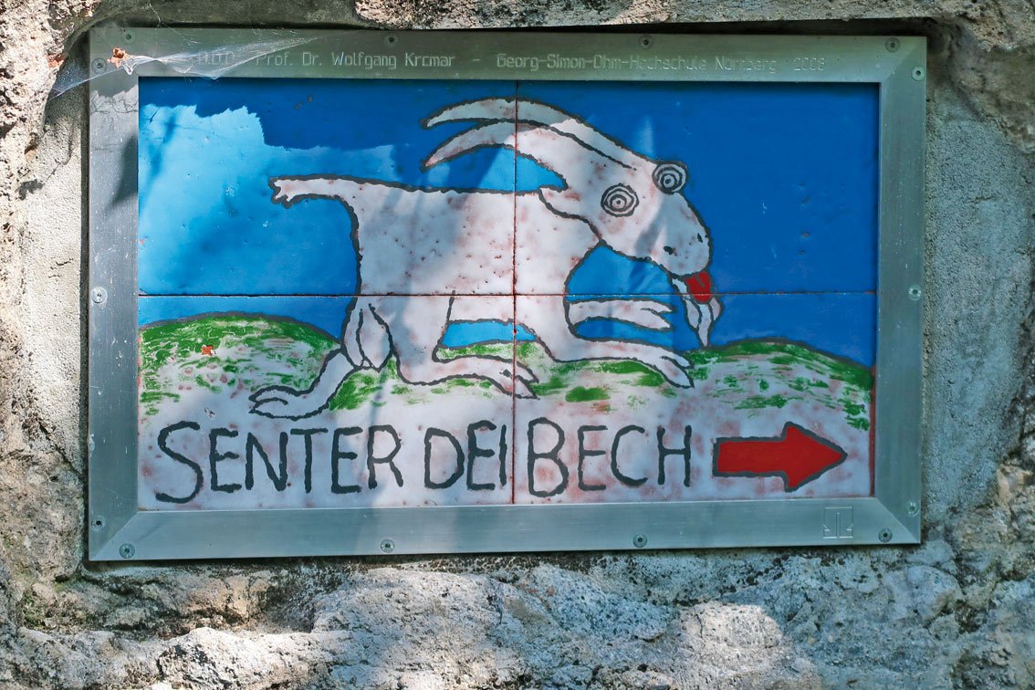 Siehe Topo. Bei der Tafel gestuft aufwärts zu den ersten Seilsicherungen (A u. A/B), danach folgt eine schöne Gratpassage (A). Leichtes Gelände (A) führt vor dem Gipfel über eine kurze Seilpassage (A) zur Fahne. Zuerst etwas absteigen, dann auf sehr schmalem Grat (exponierter Grat!) zur Abzweigung (rechts geht es zur Bocca Pasumer).