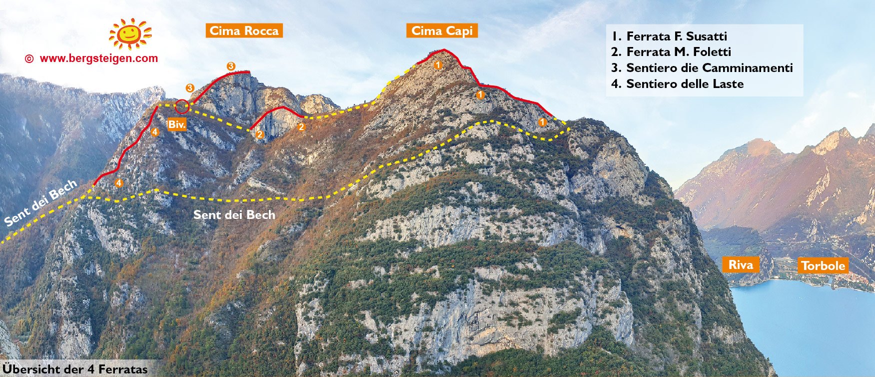 Der leichte Klassiker unter den Klettersteige rund um den Gardasee! Die Route verläuft auf einem langen Grat, direkt oberhalb des tiefblauen Sees. Neben dem Klettern an den kurzen Steilpassagen, bleibt oft Zeit, die fantastische Tiefblicke auf den Gardasee zu genießen. Man kann die Ferrata Susatti (mit der meist begonnen wird) gut mit den anderen leichten Ferratas Mario Foletti, Sentiero Camminamenti und Sentiero delle Laste kombinieren.