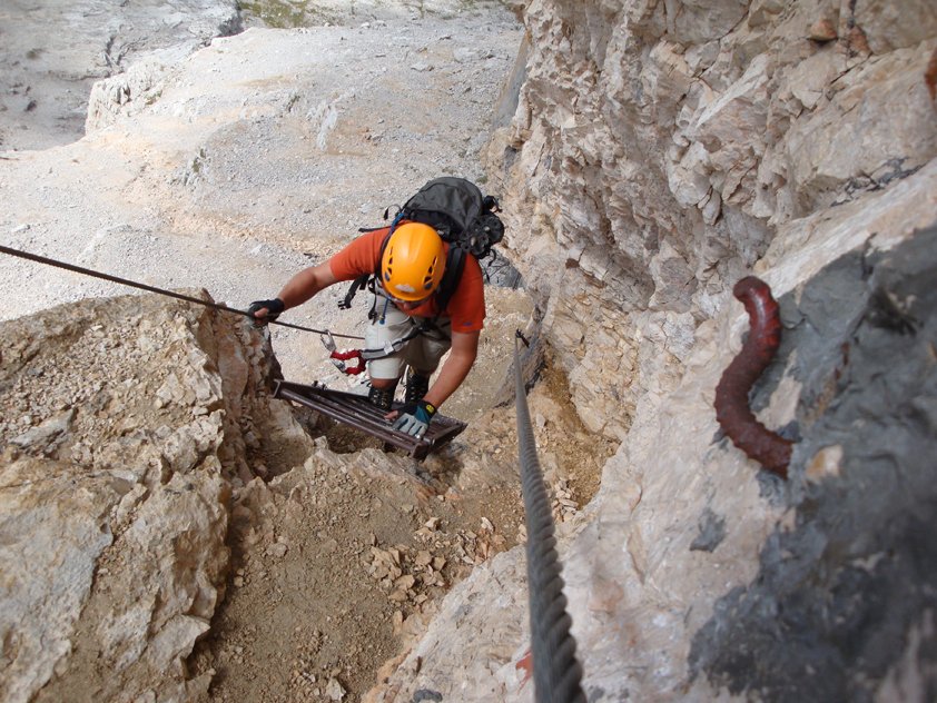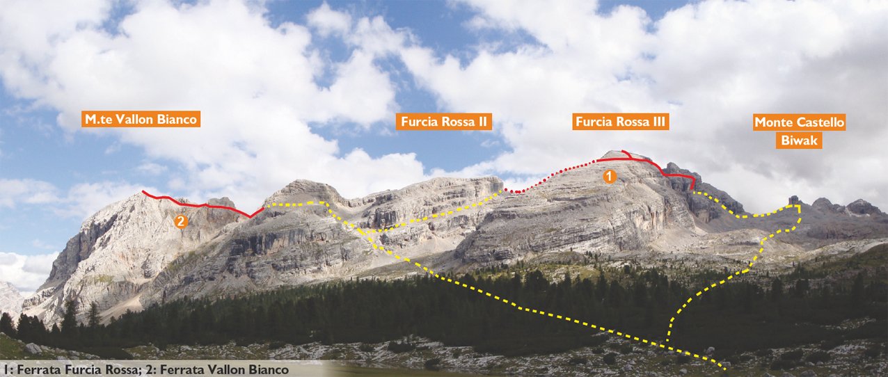 Am Anfang der Steiganlage auf einem Band unter der Furcia-Rossa II zu den Versicherungen (2580 m). Von dort steigt man zuerst steiler gestuft (B), später auf Leitern (A/B und A) zu einem Sattel ab. Auf der Nordseite der Furcia-Rossa III erreicht man über Schrofen (A) eine Leiternreihe (A/B), die auf ein Band führt. Auf diesem nach rechts bis zu einer schwarzen, sehr steilen Wandstelle (C), nach der man in einen Kessel gelangt (A). An einer Art Kante steiler (B/C) in fl aches Gelände. Auf dem Steig über Schotter bis zu einer Abzweigung, von dort links in wenigen Minuten über Schutt und Blockgelände zum höchsten Punkt der Tour - auf den Gipfel der Furcia-Rossa III, 2794 m. Zurück zur Abzweigung und weiter, bis man neuerlich versichert und nicht allzu schwer (A) hinunter (Leitern A/B) zum Gehgelände unter einer Scharte gelangt. Auf Bändern und Schutt (gehend) in der Westfl anke der Furcia-Rossa IV steigt man zu einer gelben Steilstufe ab. Über luftige Leitern (B und A/B) und schmale, niedrige Bänder (Vorsicht Kopf!) erreicht man schlussendlich ca. 50 Hm tiefer das Ende der Ferrata.