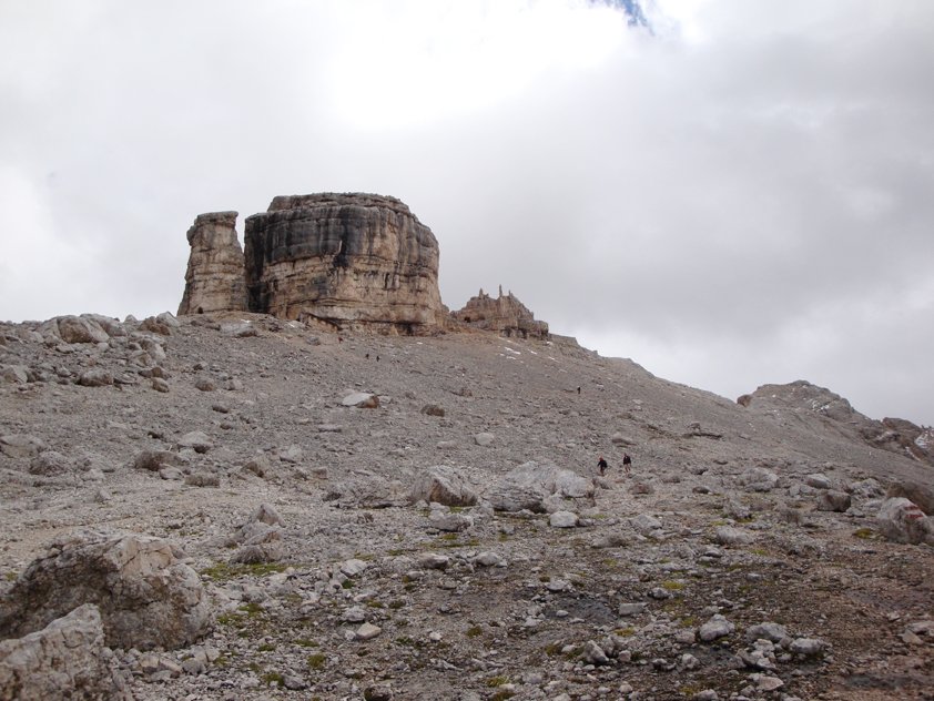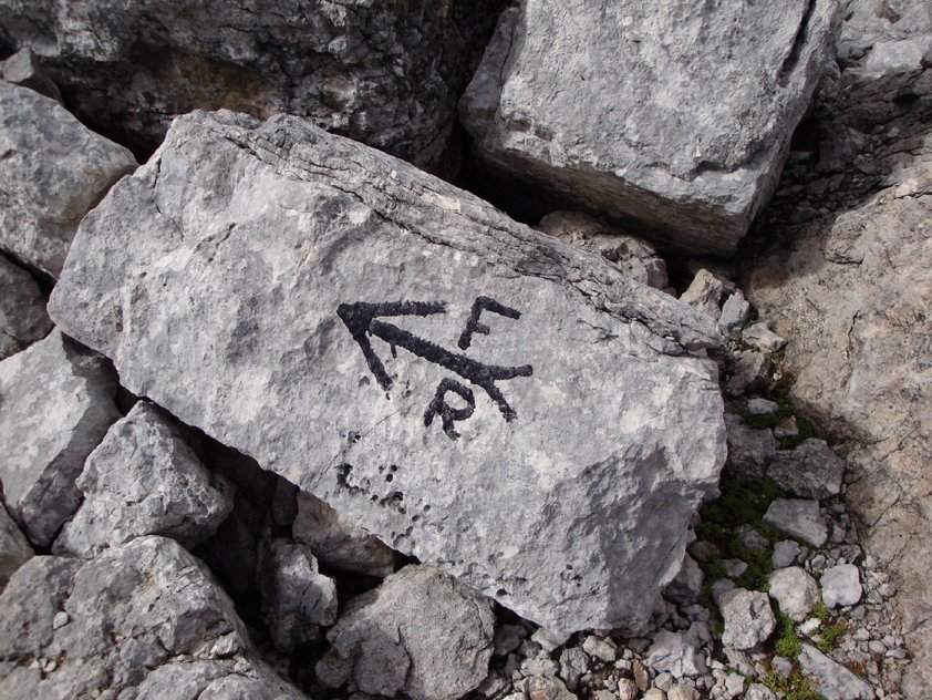 Vom Parkplatz der Capanna Alpina quert man den langen Plan de Furcia, um dann zum Col de Lòcia (2069 m) aufzusteigen (Weg Nr. 11). Von dort erreicht man über das Tadega-Joch (2157 m, Wasserscheide) und dann leicht absteigend nach ca. 2 Std. die Große Fanesalm. Bei einer Brücke, noch vor der Hütte, zweigt rechts ein Weg (17, dann auf „VB“) ab und steigt anfangs durch lichten Wald ins Vallon del Fasso an. Im Bereich einer Quelle (Schild) zweigt man rechts vor einer Steilstufe auf ein Bandsystem ab (Markierung „FR“), an dessen Ende man die ersten Sicherungen erreicht.