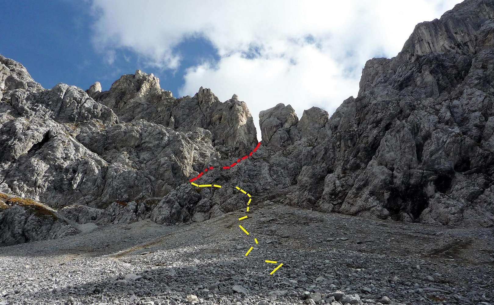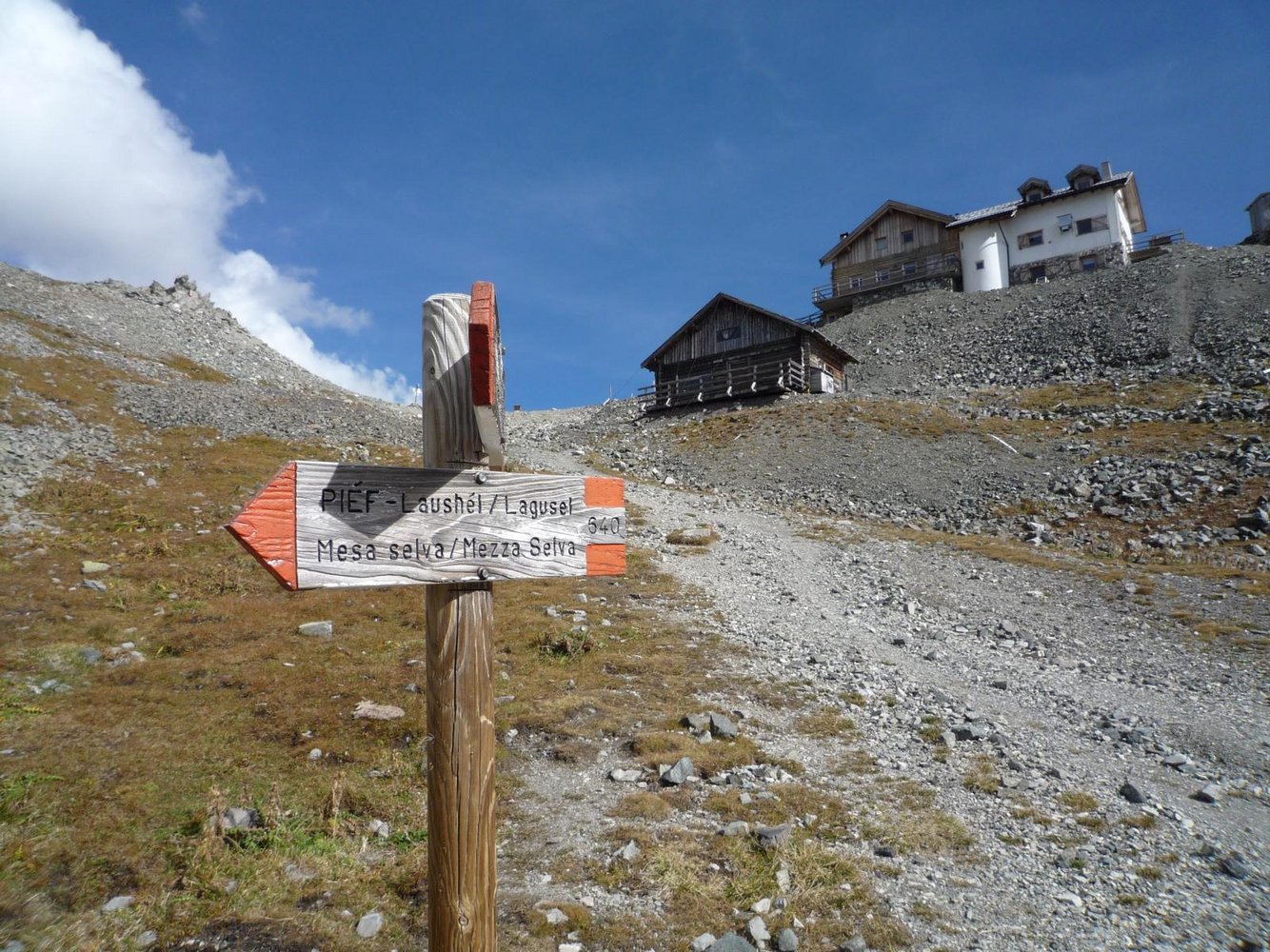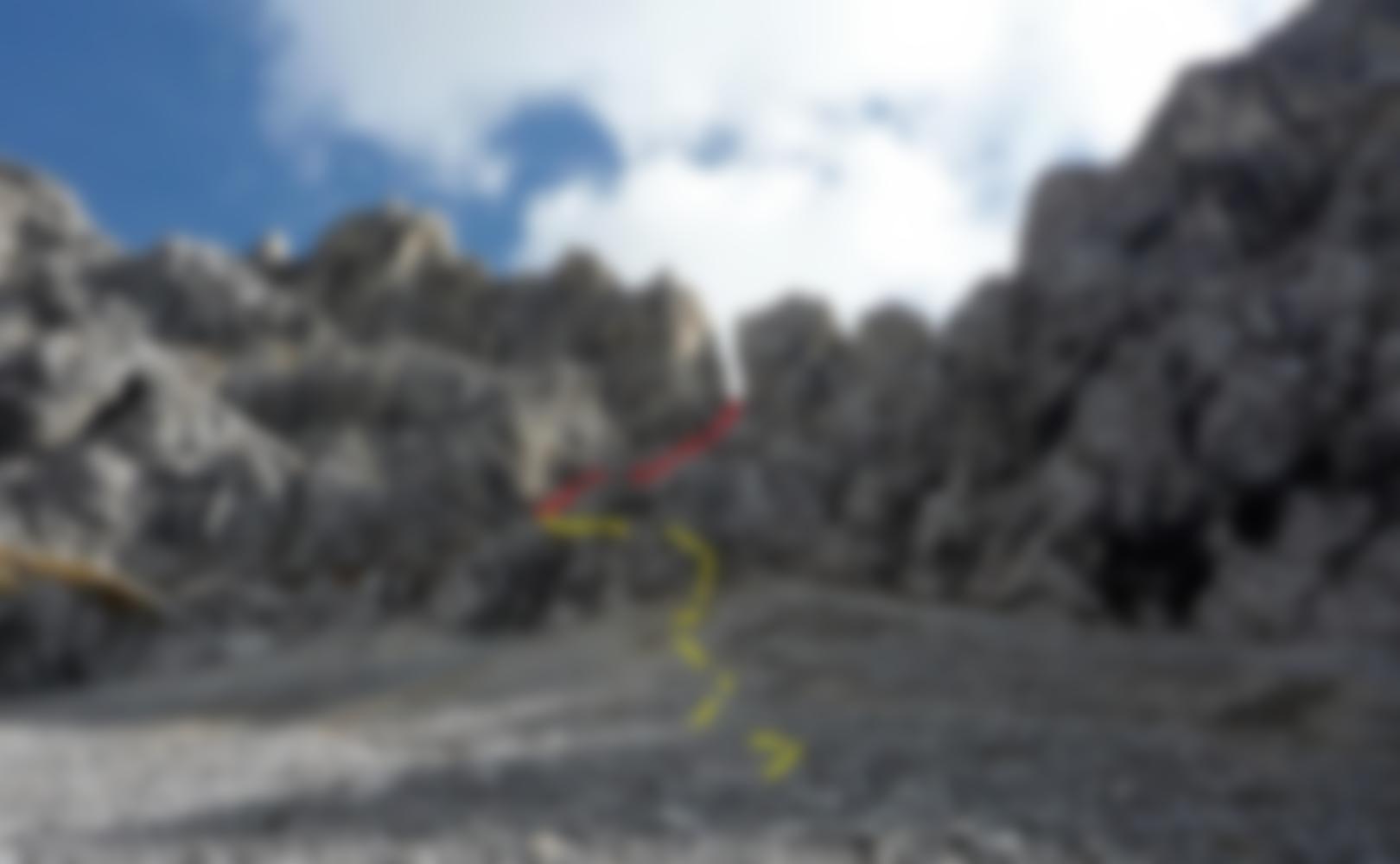 Zustieg und Route: Vom Parkplatz dem Weg 603 folgen, bis man bei der Pont de Ciamp (kurz vor der Baita Monzoni) links auf den Weg 641 zur Forc. Pief abzweigt. Gleich nach der Scharte auf dem Weg 640 in ein Kar mit der Ferrata - am Ende über Geröll zum Einstieg. Dort die ca. 40 Hm (max. B) hinauf in die Forcella dell’Ort (enger Spalt), auf der anderen Seite kurz über Geröll hinab und links auf einem Weg zum Passo delle Selle. Topo siehe Ferrata Bruno Federspiel.